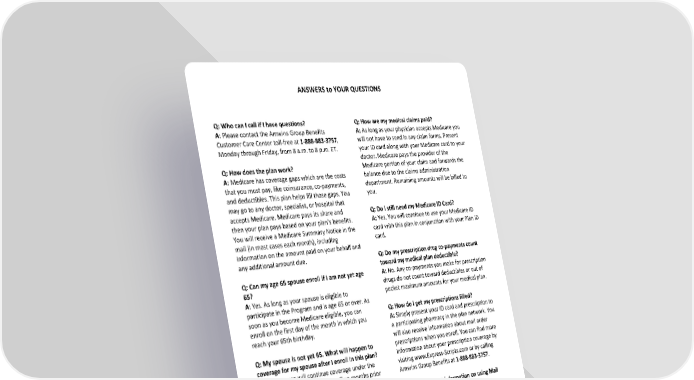 ANSWERS to YOUR QUESTIONS Q: Who can I call if I have questions? Q: How are my medical claims paid? A: Please contact the Amwins Group Benefits A: As long as your physician accepts Medicare you Customer Care Center toll-free at 1-888-883-3757, will not have to send in any claim forms. Present Monday through Friday, from 8 a.m. to 8 p.m. ET. your ID card along with your Medicare card to your doctor. Medicare pays the provider of the Q: How does the plan work? Medicare portion of your claim and forwards the A: Medicare has coverage gaps which are the costs balance due to the claims administration that you must pay, like coinsurance, co-payments, department. Remaining amounts will be billed to and deductibles. This plan helps fill those gaps. You you. may go to any doctor, specialist, or hospital that accepts Medicare. Medicare pays its share and Q: Do I still need my Medicare ID Card? then your plan pays based on your plan’s benefits. A: Yes. You will continue to use your Medicare ID You will receive a Medicare Summary Notice in the card with this plan in conjunction with your Plan ID mail (in most cases each month), including card. information on the amount paid on your behalf and any additional amount due. Q: Do my prescription drug co-payments count toward my medical plan deductible? Q: Can my age 65 spouse enroll if I am not yet age A: No. Any co-payments you make for prescription 65? drugs do not count toward deductibles or out of A: Yes. As long as your spouse is eligible to pocket maximum amounts for your medical plan. participate in the Program and is age 65 or over. As soon as you become Medicare eligible, you can Q: How do I get my prescriptions filled? enroll on the first day of the month in which you A: Simply present your ID card and prescription to reach your 65th birthday. a participating pharmacy in the plan network. You will also receive information about mail order Q: My spouse is not yet 65. What will happen to prescriptions when you enroll. You can find more coverage for my spouse after I enroll in this plan? information about your prescription coverage by A: Your spouse will continue coverage under the visiting www.Express-Scripts.com or by calling pre-Medicare early retiree plan. Two months prior Amwins Group Benefits at 1-888-883-3757. to your spouse attaining age 65, a Medicare enrollment packet will be mailed. At that time, Q: Where can I get information on using Mail your spouse should contact Social Security to enroll Order Services? in Medicare Parts A and B in order to be eligible to A: Once you enroll in the plan, you will receive a enroll in the group Medicare Plan. fulfillment kit in the mail which will include mail order through the Express Scripts Pharmacy. Please Q: Will I have to re-enroll in the Plan next year? be aware that you will need to obtain new A: No, once you enroll, you remain in the plan until prescriptions from your Doctor before ordering you elect or terminate coverage. prescriptions from this new mail order program. The necessary forms and instructions on how to Q: When will I receive my ID Cards? order prescriptions through the mail order service A: ID cards will be sent once we process your will be included in your fulfillment packet. Please enrollment materials. Medical and Prescription expect your package and materials to arrive shortly Drug ID cards will arrive in two separate packages. before your plan effective date.