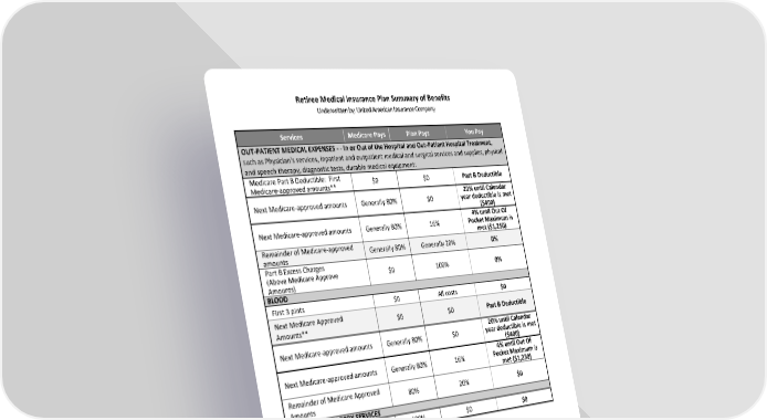 Retiree Medical Insurance Plan Summary of Benefits Underwritten by: United American Insurance Company Services Medicare Pays Plan Pays You Pay OUT-PATIENT MEDICAL EXPENSES - - In or Out of the Hospital and Out-Patient Hospital Treatment, such as Physician's services, inpatient and outpatient medical and surgical services and supplies, physical and speech therapy, diagnostic tests, durable medical equipment: Medicare Part B Deductible: First $0 $0 Part B Deductible Medicare-approved amounts** 20% until Calendar Next Medicare-approved amounts Generally 80% $0 year deductible is met ($400) 4% until Out Of Next Medicare-approved amounts Generally 80% 16% Pocket Maximum is met ($1,250) Remainder of Medicare-approved Generally 80% Generally 20% 0% amounts Part B Excess Charges (Above Medicare Approve $0 100% 0% Amounts) BLOOD First 3 pints $0 All costs $0 Next Medicare Approved $0 $0 Part B Deductible Amounts** 20% until Calendar Next Medicare-approved amounts Generally 80% $0 year deductible is met ($400) 4% until Out Of Next Medicare-approved amounts Generally 80% 16% Pocket Maximum is met ($1,250) Remainder of Medicare Approved 80% 20% $0 Amounts CLINICAL LABORATORY SERVICES Blood tests for Diagnostic Services 100% $0 $0