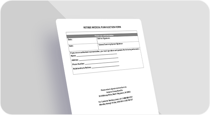 RETIREE MEDICAL PLAN ELECTION FORM Please sign and date below: Date: Retiree Signature: Date: Spouse/Surviving Spouse Signature: If you are an authorized representative, you must sign above and provide the following information: Name: _______________________________________________ Address: ______________________________________________ Phone Number: ________________________________________ Relationship to Retiree: _________________________________ Please return signed election form to: Amwins Group Benefits 50 Whitecap Drive, North Kingstown, RI 02852 For Customer Service, please call: 1-888-883-3757 Monday through Friday, 8:00 AM to 8:00 PM EST CW