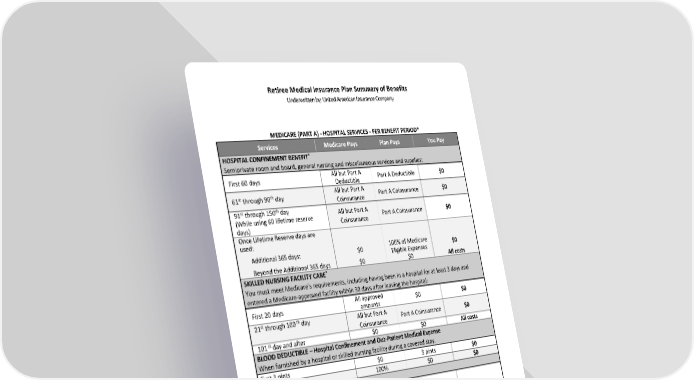 Retiree Medical Insurance Plan Summary of Benefits Underwritten by: United American Insurance Company MEDICARE (PART A) - HOSPITAL SERVICES - PER BENEFIT PERIOD* Services Medicare Pays Plan Pays You Pay HOSPITAL CONFINEMENT BENEFIT* Semiprivate room and board, general nursing and miscellaneous services and supplies: First 60 days All but Part A Part A Deductible $0 Deductible st th All but Part A $0 61 through 90 day Coinsurance Part A Coinsurance 91st through 150th day All but Part A (While using 60 lifetime reserve Coinsurance Part A Coinsurance $0 days) Once Lifetime Reserve days are used: Additional 365 days: $0 100% of Medicare $0 Eligible Expenses Beyond the Additional 365 days $0 $0 All costs SKILLED NURSING FACILITY CARE* You must meet Medicare's requirements, including having been in a hospital for at least 3 days and entered a Medicare-approved facility within 30 days after leaving the hospital: First 20 days All approved $0 $0 amounts 21st through 100th day All but Part A $0 Coinsurance Part A Coinsurance 101st day and after $0 $0 All costs BLOOD DEDUCTIBLE – Hospital Confinement and Out-Patient Medical Expense When furnished by a hospital or skilled nursing facility during a covered stay. First 3 pints $0 3 pints $0 Additional amounts 100% $0 $0 HOSPICE CARE All but very limited Available as long as your doctor coinsurance for certifies you are terminally ill and outpatient drugs $0 Balance you elect to receive these services. and inpatient respite care MEDICARE (PART B) - MEDICAL SERVICES - PER CALENDAR YEAR