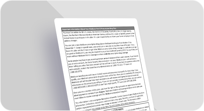 Important Information About Your Medicare Part D Prescription Drug Plan You must live within the 50 U.S. states, the District of Columbia, Puerto Rico, the U.S. Virgin Islands, Guam, the Northern Mariana Islands or American Samoa, and be a U.S. citizen or lawfully present in the United States to participate in this plan. It is your responsibility to inform your former employer of any address changes. You can join a new Medicare prescription drug plan or Medicare health plan from October 15 to December 7. Except in special cases, you cannot join a new plan at any other time of the year. If you leave this plan and don’t have or get other Medicare prescription drug coverage or creditable coverage (as good as Medicare’s), you may be required to pay a late enrollment penalty (LEP) if you go 63 days or more without Medicare Part D coverage or other creditable prescription drug coverage. Some people may have to pay an extra premium amount because of their yearly income. If you have to pay an extra amount, the Social Security Administration – not your Medicare plan – will send you a letter telling you what that extra amount will be and how to pay it. If you have any questions about this extra amount, contact the Social Security Administration at 1.800.772.1213. TTY users call 1.800.325.0778. Medicare beneficiaries with low or limited income and resources may qualify for Extra Help. If you qualify, your Medicare prescription drug plan costs will be less. Once you are enrolled in this drug plan, Medicare will tell the plan how much assistance you will receive and Express Scripts will send you information on the amount you will pay. If you are not currently receiving Extra Help, you can contact 1.800.MEDICARE (1.800.633.4227) to see if you might qualify. TTY users call 1.877.486.2048. Once you are a member of this plan, you have the right to file a grievance or appeal plan decisions about payment or services if you disagree. Read your Evidence of Coverage to know which rules you must follow to receive coverage with this Medicare prescription drug plan. This information is not a complete description of benefits. Contact Express Scripts Medicare for more information. Limitations, copayments and restrictions may apply. Benefits, premium (if applicable) and/or copayments/coinsurance may change on January 1 of each year. The formulary and/or pharmacy network may change at any time. You will receive notice when necessary. Release of Information: By joining this Medicare prescription drug plan, I acknowledge that Express Scripts Medicare can release my information to Medicare and other plans as is necessary for treatment, payment and health care operations. I also acknowledge that Express Scripts Medicare can release my information, including my prescription drug event data, to Medicare, who may release it for research and other purposes that follow all applicable Federal statutes and regulations. Retiree’s Signature: Today’s Date: Spouse or Surviving Spouse’s Signature: Today’s Date: Express Scripts Medicare (PDP) is a prescription drug plan with a Medicare contract. Enrollment in Express Scripts Medicare depends on contract renewal. © 2019 Express Scripts Holding Company. All Rights Reserved
