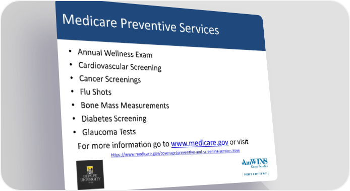 Medicare Preventive Services • Annual Wellness Exam • Cardiovascular Screening • Cancer Screenings • Flu Shots • Bone Mass Measurements • Diabetes Screening • Glaucoma Tests For more information go to www.medicare.gov or visit https://www.medicare.gov/coverage/preventive-and-screening-services.html