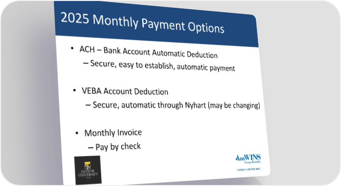 2025 Monthly Payment Options • ACH – Bank Account Automatic Deduction –Secure, easy to establish, automatic payment • VEBA Account Deduction –Secure, automatic through Nyhart (may be changing) • Monthly Invoice –Pay by check