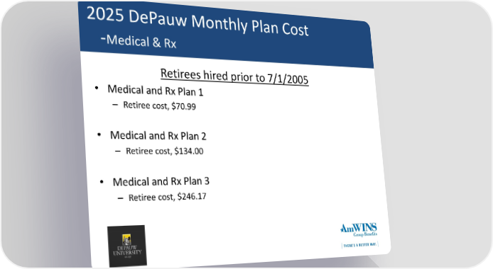 2025 DePauw Monthly Plan Cost -Medical & Rx Retirees hired prior to 7/1/2005 • Medical and Rx Plan 1 – Retiree cost, $70.99 • Medical and Rx Plan 2 – Retiree cost, $134.00 • Medical and Rx Plan 3 – Retiree cost, $246.17