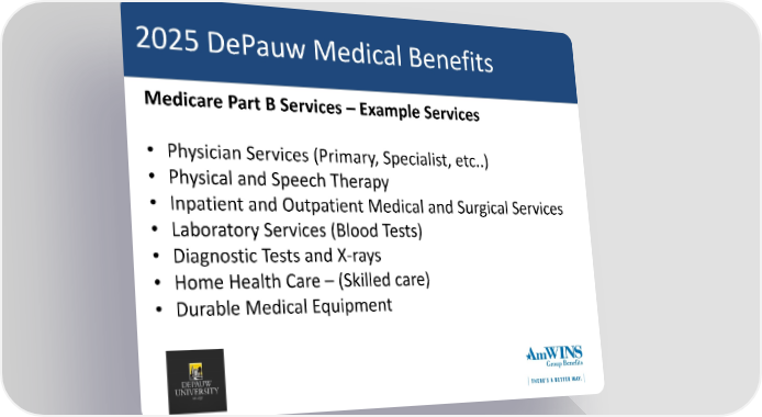2025 DePauw Medical Benefits Medicare Part B Services – Example Services • Physician Services (Primary, Specialist, etc..) • Physical and Speech Therapy • Inpatient and Outpatient Medical and Surgical Services • Laboratory Services (Blood Tests) • Diagnostic Tests and X-rays • Home Health Care – (Skilled care) • Durable Medical Equipment