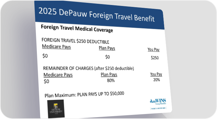 2025 DePauw Foreign Travel Benefit Foreign Travel Medical Coverage FOREIGN TRAVEL $250 DEDUCTIBLE Medicare Pays Plan Pays You Pay $0 $0 $250 REMAINDER OF CHARGES (after $250 deductible) Medicare Pays Plan Pays You Pay $0 80% 20% Plan Maximum: PLAN PAYS UP TO $50,000