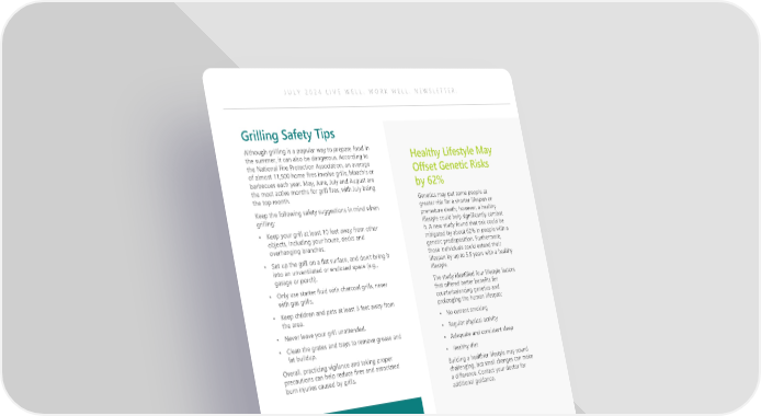 JULY 2024 LIVE WELL. WORK WELL. NEWSLETTER: Grilling Safety Tips Although grilling is a popular way to prepare food in the summer, it can also be dangerous. According to Healthy Lifestyle May the National Fire Protection Association, an average Offset Genetic Risks of almost 11,500 home fires involve grills, hibachis or barbecues each year. May, June, July and August are by 62% the most active months for grill fires, with July being the top month. Genetics may put some people at Keep the following safety suggestions in mind when greater risk for a shorter lifespan or grilling: premature death; however, a healthy • Keep your grill at least 10 feet away from other lifestyle could help significantly combat objects, including your house, decks and it. A new study found that risk could be overhanging branches. mitigated by about 62% in people with a genetic predisposition. Furthermore, • Set up the grill on a flat surface, and don’t bring it those individuals could extend their into an unventilated or enclosed space (e.g., lifespan by up to 5.5 years with a healthy garage or porch). lifestyle. • Only use starter fluid with charcoal grills, never The study identified four lifestyle factors with gas grills. that offered better benefits for • Keep children and pets at least 3 feet away from counterbalancing genetics and the area. prolonging the human lifespan: • Never leave your grill unattended. • No current smoking • Clean the grates and trays to remove grease and • Regular physical activity fat buildup. • Adequate and consistent sleep Overall, practicing vigilance and taking proper • Healthy diet precautions can help reduce fires and associated Building a healthier lifestyle may sound burn injuries caused by grills. challenging, but small changes can make a difference. Contact your doctor for additional guidance. Safe Food Temperatures Poultry Ground meats Steaks and chops Fish 165 F 160 F 145 F 145 F