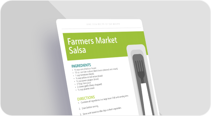 JUNE 2024 RECIPE OF THE MONTH Farmers Market Salsa INGREDIENTS • ½ cup corn (fresh or frozen • 15 oz. can low-sodium black beans (drained and rinsed) • 1 cup tomatoes (diced) • ½ cup yellow or red onion (diced) • ½ cup green pepper (diced) • 2 Tbsp. lime juice • 2 cloves garlic (finely chopped) • ½ cup picante sauce DIRECTIONS 1. Combine all ingredients in a large bowl. Chill until serving time. 2. Drain before serving. 3. Serve with baked tortilla chips or fresh vegetables. Makes: 8 Servings NUTRITIONAL INFORMATION (1 Serving) Calories 73 Dietary Fiber 5 g Total fat 0 g Total sugars 3 g Saturated Fat 0 g Added Sugars Included 0 g Sodium 202 mg Protein 4 g Carbohydrate 14 g