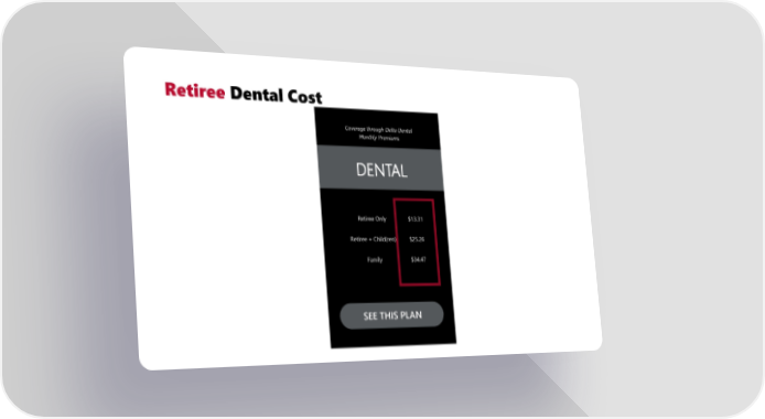 Pre-65 Retiree Benefit Guide Page 3 Page 5Retiree Dental Cost DENTAL Coverage through Delta Dental Monthly Premiums SEE THIS PLAN Retiree Only $13.31 Retiree + Child(ren) $25.26 Family $34.47