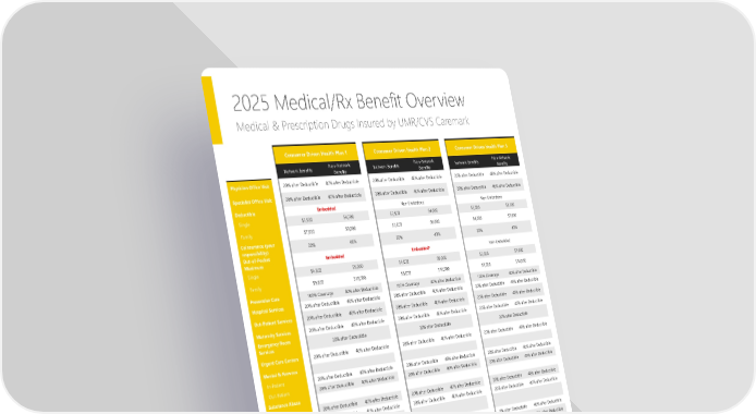 2025 Medical/Rx Benefit Overview Medical & Prescription Drugs Insured by UMR/CVS Caremark Consumer Driven Health Plan 1 Consumer Driven Health Plan 2 Consumer Driven Health Plan 3 Network Benefits Non-Network Network Benefits Non-Network Network Benefits Non-Network Benefits Benefits Benefits Physician Office Visit 20% after Deductible 40% after Deductible 20% after Deductible 40% after Deductible 20% after Deductible 40% after Deductible Specialist Office Visit 20% after Deductible 40% after Deductible 20% after Deductible 40% after Deductible 20% after Deductible 40% after Deductible Deductible Embedded Non-Embedded Non-Embedded Single $3,500 $4,500 $2,500 $4,000 $2,000 $3,500 Family $7,000 $9,000 $5,000 $8,000 $4,000 $7,000 Coinsurance (your 20% 40% 20% 40% 20% 40% responsibility) Out-of-Pocket Embedded Embedded* Non-Embedded Maximum Single $4,500 $9,000 $4,000 $8,000 $3,500 $7,000 Family $9,000 $18,000 $8,000 $16,000 $7,000 $14,000 Preventive Care 100% Coverage 40% after Deductible 100% Coverage 40% after Deductible 100% Coverage 40% after Deductible Hospital Services 20% after Deductible 40% after Deductible 20% after Deductible 40% after Deductible 20% after Deductible 40% after Deductible Out-Patient Services 20% after Deductible 40% after Deductible 20% after Deductible 40% after Deductible 20% after Deductible 40% after Deductible Maternity Services 20% after Deductible 40% after Deductible 20% after Deductible 40% after Deductible 20% after Deductible 40% after Deductible Emergency Room 20% after Deductible 20% after Deductible 20% after Deductible Services Urgent Care Centers 20% after Deductible 40% after Deductible 20% after Deductible 40% after Deductible 20% after Deductible 40% after Deductible Mental & Nervous In-Patient 20% after Deductible 40% after Deductible 20% after Deductible 40% after Deductible 20% after Deductible 40% after Deductible Out-Patient 20% after Deductible 40% after Deductible 20% after Deductible 40% after Deductible 20% after Deductible 40% after Deductible Substance Abuse In-Patient 20% after Deductible 40% after Deductible 20% after Deductible 40% after Deductible 20% after Deductible 40% after Deductible Out-Patient 20% after Deductible 40% after Deductible 20% after Deductible 40% after Deductible 20% after Deductible 40% after Deductible Retail Prescription Drugs Generic 0% after Deductible 40% after Deductible 0% after Deductible 40% after Deductible 0% after Deductible 40% after Deductible Preferred 40% after Deductible 40% after Deductible 40% after Deductible 40% after Deductible 40% after Deductible 40% after Deductible Non-Preferred 50% after Deductible 40% after Deductible 50% after Deductible 40% after Deductible 50% after Deductible 40% after Deductible Mail Order Prescription Drugs Generic 0% after Deductible Not Covered 0% after Deductible Not Covered 0% after Deductible Not Covered Preferred 40% after Deductible Not Covered 40% after Deductible Not Covered 40% after Deductible Not Covered Non-Preferred 50% after Deductible Not Covered 50% after Deductible Not Covered 50% after Deductible Not Covered Lifetime Maximum Unlimited Unlimited Unlimited * No individual shall incur more than $7,500 of out-of-pocket expenses for covered services. Medical Administration by UMR: UMR has negotiated discounts with a large national network of doctors and hospitals named United Healthcare Choice Plus. You will enjoy the highest level of benefits and the greatest value if you choose to receive care through the Choice Plus Network of providers. While it is not required that you utilize the network, the services you obtain outside of the network will be billed at a greater cost to you. You may log onto www.umr.com for a listing of participating providers. This benefit guide only highlights the benefits available. For a more complete description, see the Plan Certificate. 9 If any conflict should arise between this summary and the Plan, the Plan's Certificate will govern in all cases.