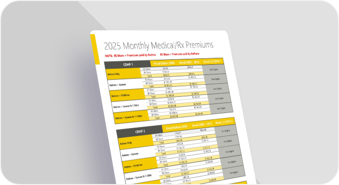 2025 Monthly Medical/Rx Premiums NOTE: EE Share = Premiums paid by Retiree ER Share = Premiums paid by DePauw CDHP 1 Hired Before 2005 Hired 2005 – 2012 Hired 1/1/2013+ EE Share $92.66 $858.91 Retiree Only ER Share $766.25 - Not Eligible Total $858.91 $858.91 EE Share $212.57 $1,803.75 Retiree + Spouse ER Share $1,591.18 - Not Eligible Total $1,803.75 $1,803.75 EE Share $198.57 $1,590.06 Retiree + Child/ren ER Share $1,391.49 - Not Eligible Total $1,590.06 $1,590.06 EE Share $328.56 $2,662.68 Retiree + Spouse & 1 Child ER Share $2,334.12 - Not Eligible Total $2,662.68 $2,662.68 EE Share $453.73 $2,662.68 Retiree + Spouse & >1 Child ER Share $2,208.95 - Not Eligible Total $2,662.68 $2,662.68 CDHP 2 Hired Before 2005 Hired 2005 – 2012 Hired 1/1/2013+ EE Share $103.47 $865.46 Retiree Only ER Share $761.99 - Not Eligible Total $865.46 $865.46 EE Share $235.28 $1,817.51 Retiree + Spouse ER Share $1,582.23 - Not Eligible Total $1,817.51 $1,817.51 EE Share $218.59 $1,602.18 Retiree + Child/ren ER Share $1,383.59 - Not Eligible Total $1,602.18 $1,602.18 EE Share $362.09 $2,683.00 Retiree + Spouse & 1 Child ER Share $2,320.91 - Not Eligible Total $2,683.00 $2,683.00 EE Share $487.25 $2,683.00 Retiree + Spouse & >1 Child ER Share $2,195.75 - Not Eligible Total $2,683.00 $2,683.00 CDHP 3 Hired Before 2005 Hired 2005 – 2012 Hired 1/1/2013+ EE Share $168.82 $898.34 Retiree Only ER Share $729.52 - Not Eligible Total $898.34 $898.34 EE Share $415.74 $1,886.54 Retiree + Spouse ER Share $1,470.80 - Not Eligible Total $1,886.54 $1,886.54 EE Share $363.35 $1,663.03 Retiree + Child/ren ER Share $1,299.68 - Not Eligible Total $1,663.03 $1,663.03 EE Share $618.96 $2,784.88 Retiree + Spouse & 1 Child ER Share $2,165.92 - Not Eligible Total $2,784.88 $2,784.88 EE Share $744.13 $2,784.88 Retiree + Spouse & >1 Child ER Share $2,040.75 - Not Eligible Total $2,784.88 $2,784.88 This benefit guide only highlights the benefits available. For a more complete description, see the Plan Certificate. 10 If any conflict should arise between this summary and the Plan, the Plan's Certificate will govern in all cases.