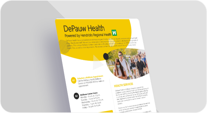 Added Slide / Layouts DePauw Health Enter your subhead line here Powered by Hendricks Regional Health DePauw Health has a comprehensive wellness program that focuses on the physical, emotional and spiritual health of our faculty and staff. We want our employees to lead balanced lives and commit to developing lifelong habits of wellness. The campus Wellness Center is available to all faculty and staff participating on the DePauw University Health Plan, as well as their dependents. The wellness center is located on the second floor of The Lilly Center. 01 Schedule a Wellness Appointment Call the DePauw Health Wellness Center at (765) 658-4555 to make an appointment. HEALTH SERVICES 02 Wellness Center Hours DePauw Health at DePauw University supports the Monday – 8 a.m. to 12 p.m. academic success, physical health and mental well-being of Tuesday – 1 p.m. to 5 p.m. faculty and staff by providing the highest quality offerings Wednesday – 8 a.m. to 12 p.m. in a timely and confidential manner. All faculty, staff and Thursday – 1 p.m. to 5 p.m. their dependents covered under the DePauw University Friday – 12 p.m. to 4 p.m. health plan are eligible to use the Center’s medical services. There is no fee for most services provided in the wellness center as they are covered through health insurance www.DePauwHealth.org premium contributions. Services include: • Clinic visits – annual physicals, musculoskeletal visits, sick visits, and wellness coaching. • Chronic disease management – support from clinical staff to better manage conditions such as diabetes, high cholesterol, asthma and others. Schedule a Wellness Coaching • Health risk assessments – helps identify targeted 03 Session concerns and preventive health goals. Please call (317) 718-8160 to schedule a • Referrals and care navigation – support in the personalized wellness coaching coordination of specialty referrals when needed, as well appointment with a certified Wellness as the management of follow-up care. Nurse. • Home Delivery & On-site pharmacy services – features a formulary of the most commonly utilized medications. • Lab draws – conveniently available on-site with rapid results turnaround. This benefit guide only highlights the benefits available. For a more complete description, see the Plan Certificate. 17 If any conflict should arise between this summary and the Plan, the Plan's Certificate will govern in all cases.