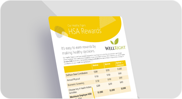 Our Healthy Tigers HSA Rewards It’s easy to earn rewards by making healthy decisions. Our Healthy Tigers is a wellness program designed to incentivize you to prioritize your preventive care through earned employer HSA contributions. In addition to your annual base employer HSA contribution, you can earn up to an extra $500 (if enrolled in Retiree-Only coverage) or $1,000 (if enrolled in Retiree + Dependent(s) coverage) of contributions to your Health Savings Account! Retiree Spouse Retiree + Child(ren) DePauw Base Contribution $500 $500 $1,000 Annual Physical $150 $150 $300 Biometric Screening $150 $150 $300 Choose Any 4 Health Action $200 $200 $400 Activities Maximum Employer HSA $1,000 $1,000 $2,000 Contribution Health Action Activities (Pick Any 4) Learn More about Our • Dental Exam • Eye Exam Healthy Tigers • Colonoscopy • Pap Smear • Mammogram • Prostate Exam • Skin Check • Heart Scan Visit WellRight • Cancer Screening • Health Assessment • Diabetes • Mental Health Assessment • Move it – 7,000 daily • Healthy U – complete 5 steps for 90 days short (5-10 minute) courses This benefit guide only highlights the benefits available. For a more complete description, see the Plan Certificate. 12 If any conflict should arise between this summary and the Plan, the Plan's Certificate will govern in all cases.