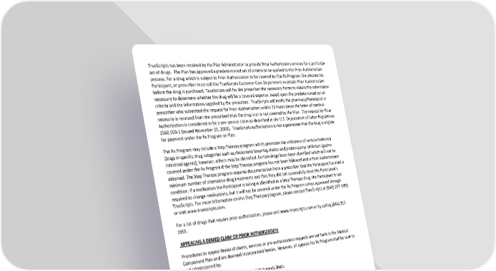 TrueScripts has been retained by the Plan Administrator to provide Prior Authorization services for a particular set of drugs. The Plan has approved a predetermined set of criteria to be applied to this Prior Authorization process. For a drug which is subject to Prior Authorization to be covered by this Rx Program; the pharmacist, Participant, or prescriber must call the TrueScripts Customer Care Department to obtain Prior Authorization before the drug is purchased. TrueScripts will fax the prescriber the necessary forms to obtain the information necessary to determine whether the drug will be a covered expense, based upon the predetermined set of criteria and the information supplied by the prescriber. TrueScripts will notify the pharmacy/Participant or prescriber who submitted the request for Prior Authorization within 72 hours (once the letter of medical necessity is received from the prescriber) that the drug is or is not covered by the Plan. The request for Prior Authorization is considered to be a pre-service claim as described in the U.S. Department of Labor Regulations 2560.503-1 (issued November 21, 2000). TrueScripts authorization is not a guarantee that the drug is eligible for payment under the Rx Program or Plan. The Rx Program may include a Step Therapy program which promotes the utilization of certain Preferred Drugs in specific drug categories such as cholesterol lowering statins and proton pump inhibitors (gastro- intestinal agents); however, others may be identified. Certain drugs have been identified which will not be covered under the Rx Program if the Step Therapy program has not been followed and a Prior Authorization obtained. The Step Therapy program requires documentation from a prescriber that the Participant has tried a minimum number of alternative drug treatments and that they did not successfully treat the Participant’s condition. If a medication the Participant is taking is identified as a Step Therapy drug, the Participant is not required to change medications, but it will not be covered under the Rx Program unless approved through TrueScripts. For more Information on this Step Therapy program, please contact TrueScripts at (844) 257-1955 or visit www.truescripts.com. For a list of drugs that require prior authorization, please visit www.truescripts.com or by calling (844) 257- 1955. APPEALING A DENIED CLAIM OR PRIOR AUTHORIZATION Procedures to appeal denial of claims, services or pre-authorization requests are set forth in the Medical Component Plan and are deemed incorporated herein. However, all appeals for Rx Program shall be sent to and administered by: TrueScripts Management Services, LLC, C/O Appeals Dept. 513 E. South St. Washington, IN 47501. TrueScripts has the discretionary authority to determine the right to benefits and any appeals under the Rx Program. EMERGENCY SUPPLY For covered medications under this Rx Program and in instances in which a Prior Authorization cannot be immediately obtained, Participants may receive and be reimbursed for up to a 72-hour supply of a covered Huntington County Community Schools Prescription Benefits Program SPD January 1, 2025 Page 11 of 15