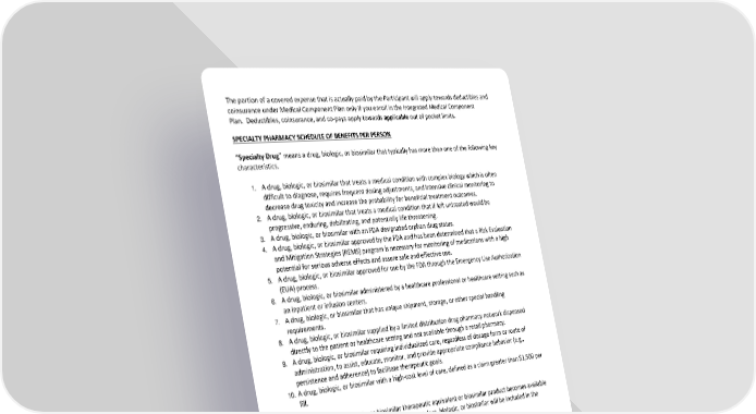 The portion of a covered expense that is actually paid by the Participant will apply towards deductibles and coinsurance under Medical Component Plan only if you enroll in the Integrated Medical Component Plan. Deductibles, coinsurance, and co-pays apply towards applicable out of pocket limits. SPECIALTY PHARMACY SCHEDULE OF BENEFITS PER PERSON “Specialty Drug” means a drug, biologic, or biosimilar that typically has more than one of the following key characteristics. 1. A drug, biologic, or biosimilar that treats a medical condition with complex biology which is often difficult to diagnose, requires frequent dosing adjustments, and intensive clinical monitoring to decrease drug toxicity and increase the probability for beneficial treatment outcomes. 2. A drug, biologic, or biosimilar that treats a medical condition that if left untreated would be progressive, enduring, debilitating, and potentially life threatening. 3. A drug, biologic, or biosimilar with an FDA designated orphan drug status. 4. A drug, biologic, or biosimilar approved by the FDA and has been determined that a Risk Evaluation and Mitigation Strategies (REMS) program is necessary for monitoring of medications with a high potential for serious adverse effects and assure safe and effective use. 5. A drug, biologic, or biosimilar approved for use by the FDA through the Emergency Use Authorization (EUA) process. 6. A drug, biologic, or biosimilar administered by a healthcare professional or healthcare setting such as an inpatient or infusion centers. 7. A drug, biologic, or biosimilar that has unique shipment, storage, or other special handling requirements. 8. A drug, biologic, or biosimilar supplied by a limited distribution drug pharmacy network dispensed directly to the patient or healthcare setting and not available through a retail pharmacy. 9. A drug, biologic, or biosimilar requiring individualized care, regardless of dosage form or route of administration, to assist, educate, monitor, and provide appropriate compliance behavior (e.g., persistence and adherence) to facilitate therapeutic goals. 10. A drug, biologic, or biosimilar with a high-cost level of care, defined as a claim greater than $1,500 per fill. Note: If a drug, biologic, or biosimilar therapeutic equivalent or biosimilar product becomes available for a brand specialty drug, then the equivalent drug, biologic, or biosimilar will be included in the Specialty Drug list. If the Plan covers Specialty Drugs, a prior authorization is required for all Specialty Drugs, a list of which can be obtained by calling TrueScripts at (844) 257-1955. First time dispensing of a Specialty Drug may be limited to less than a 30-day supply when not prepackaged for a larger quantity. Additionally, a maximum unit of measure quantity limit per person/plan year may apply to some Specialty Drugs. Covered prescription injectable(s) and certain other specialty drugs such as chemotherapies may only be available through a designated specialty pharmacy. Specialty Drugs are categorized into the above Copay Tiers under Schedule of Huntington County Community Schools Prescription Benefits Program SPD January 1, 2025 Page 6 of 15