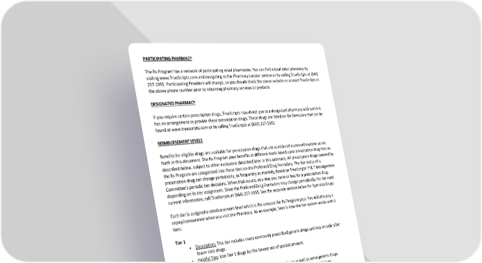PARTICIPATING PHARMACY The Rx Program has a network of participating retail pharmacies. You can find a local retail pharmacy by visiting www.TrueScripts.com and navigating to the Pharmacy Locator section or by calling TrueScripts at (844) 257-1955. Participating Providers will change, so you should check the above website or contact TrueScripts at the above phone number prior to obtaining pharmacy services or products. DESIGNATED PHARMACY If you require certain prescription drugs, TrueScripts may direct you to a designated pharmacy with which it has an arrangement to provide those prescription drugs. These drugs are listed on the formulary that can be found at www.truescripts.com or by calling TrueScripts at (844) 257-1955. REIMBURSEMENT LEVELS Benefits for eligible drugs are available for prescription drugs that are considered a covered expense as set forth in this document. The Rx Program pays benefits at different levels based upon prescription drug tiers as described below, subject to other exclusions described later in this summary. All prescription drugs covered by the Rx Program are categorized into these tiers on the Preferred Drug Formulary. The tier status of a prescription drug can change periodically, as frequently as monthly, based on TrueScripts’ P & T Management Committee’s periodic tier decisions. When that occurs, you may pay more or less for a prescription drug, depending on its tier assignment. Since the Preferred Drug Formulary may change periodically, for the most current information, call TrueScripts at (844)-257-1955. See the separate section below for Specialty Drugs. Each tier is assigned a reimbursement level which is the amount the Rx Program pays. You will also pay a copay/coinsurance when you visit the Pharmacy. As an example, here is how the tier system works with 3 tiers: Tier 1 • Description: This tier includes many commonly prescribed generic drugs and may include other lower-cost drugs. • Helpful Tips: Use Tier 1 drugs for the lowest out-of-pocket amount. Tier 2 • Description: This tier includes preferred brand-name drugs as well as some generic drugs. • Helpful Tips: Tier 2 drugs will generally have a lower out-of-pocket than Tier 3 drugs. Tier 3 • Description: This tier includes non-preferred brand-name drugs as well as some generic drugs. • Helpful Tips: Tier 3 drugs generally have the highest out-of-pocket cost. Ask your doctor if switching to an alternative drug from Tier 1 or Tier 2 may be right for you. You are responsible for your deductible, if any, or paying the lowest of: Huntington County Community Schools Prescription Benefits Program SPD January 1, 2025 Page 3 of 15
