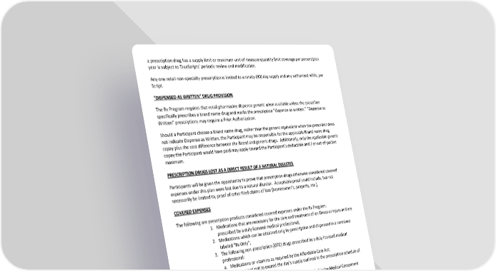 a prescription drug has a supply limit or maximum unit of measure quantity limit coverage per person/plan year is subject to TrueScripts’ periodic review and modification. Any one retail non-specialty prescription is limited to a ninety (90) day supply and any authorized refills, per Script. “DISPENSED AS WRITTEN” DRUG PROVISION The Rx Program requires that retail pharmacies dispense generic when available unless the prescriber specifically prescribes a brand name drug and marks the prescription “dispense as written.” “Dispense as Written” prescriptions may require a Prior Authorization. Should a Participant choose a Brand name drug, rather than the generic equivalent when the prescriber does not indicate Dispense as Written, the Participant may be responsible for the applicable Brand name drug copay plus the cost difference between the Brand and generic drugs. Additionally, only the applicable generic copay the Participant would have paid may apply toward the Participant’s deductible and / or out-of-pocket maximum. PRESCRIPTION DRUGS LOST AS A DIRECT RESULT OF A NATURAL DISASTER Participants will be given the opportunity to prove that prescription drugs otherwise considered covered expenses under this plan were lost due to a natural disaster. Acceptable proof could include, but not necessarily be limited to, proof of other filed claims of loss (homeowner’s, property, etc.). COVERED EXPENSES The following are prescription products considered covered expenses under the Rx Program: 1. Medications that are necessary for the care and treatment of an illness or injury and are prescribed by a duly licensed medical professional; 2. Medications which can be obtained only by prescription and dispensed in a container labeled “Rx Only”; 3. The following non-prescription (OTC) drugs prescribed by a duly licensed medical professional: a. Medications or vitamins as required by the Affordable Care Act; b. In an amount not to exceed the day’s supply outlined in the prescription schedule of benefits; and c. All other non-prescription OTC drugs that are included in the Medical Component Plan document. 4. Medications for medical treatment or prescription coverage not otherwise excluded by the Medical Component Plan or this Rx Program; and 5. Covered medications prescribed and filled while the Participant is a Participant in this Rx Program. Huntington County Community Schools Prescription Benefits Program SPD January 1, 2025 Page 8 of 15