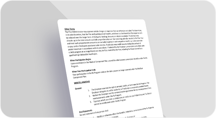 Other Terms The Plan Administrator may approve certain charges or expenses that are otherwise excluded if it determines, in its sole discretion, that the Plan and participant will benefit, and there is a likelihood that Plan expenses will be reduced over the longer term. If third party funding, discount, or rebate is available, TrueScripts may allocate up to the total amount available proportionately over the remaining calendar months in the Plan Year and treat such proportionate amount as an excluded expense in each respective month, or, in the event the co-pay card or third party assistance is de minimis, TrueScripts may credit towards deductible and out of pocket maximum in accordance with its procedures. If selected by the Employer, prescriptions provided under a 340B program at an insignificant cost may be fully covered by the Plan, including for those covered by a qualified high deductible health plan. When Participation Begins Upon enrollment in the Medical Component Plan, you will be able to access prescription benefits under the Rx Program. When Your Participation Ends Your participation in the Rx Program ends on the date you are no longer covered under the Medical Component Plan. MISCELLANEOUS General 1. The Employer reserves the right to amend, modify, or terminate the Rx Program. The Employer delegates its settlor authority to TrueScripts as expressly provided herein. 2. Neither the Employer nor the service providers guarantee the tax consequences of any reimbursements under this Rx Program. 3. Expenses which you claim as deductions or credits on your Federal Income Tax Return cannot be reimbursed under the Rx Program. Oral Statements No oral statement of any person shall: 1. Modify or otherwise affect the benefits, limitations, or exclusions of the Rx Program; 2. Convey or void any coverage; 3. Increase or reduce any benefits of the Rx Program; or 4. Be used in the prosecution or defense of a claim under the Rx Program. Plan is not Worker’s Compensation Insurance The coverage provided under the Rx Program does not replace, supplement, or provide a substitute for benefits to which you are entitled under worker’s compensation; occupational disease; and similar laws. The Rx Program does not cover health services or expenses, directly or indirectly, related to such services that are provided or payable under worker’s compensation, occupational disease, and similar laws: 1. Even if you or the Employer are/is not properly insured or self-insured under such laws; Huntington County Community Schools Prescription Benefits Program SPD January 1, 2025 Page 14 of 15