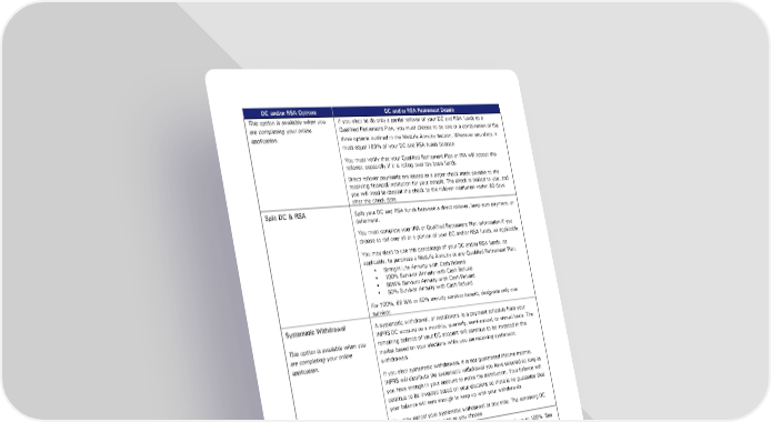 DC and/or RSA Options DC and/or RSA Retirement Details This option is available when you If you elect to do only a partial rollover of your DC and RSA funds to a are completing your online Qualified Retirement Plan, you must choose to do one or a combination of the application. three options outlined in the MetLife Annuity section. Whatever you elect, it must equal 100% of your DC and RSA funds balance. You must verify that your Qualified Retirement Plan or IRA will accept the rollover, especially if it is rolling over tax basis funds. Direct rollover payments are issued as a paper check made payable to the receiving financial institution for your benefit. The check is mailed to you, and you will need to deposit the check to the rollover institution within 60 days after the check date. Split DC & RSA Split your DC and RSA funds between a direct rollover, lump sum payment, or deferment. You must complete your IRA or Qualified Retirement Plan information if you choose to roll over all or a portion of your DC and/or RSA funds, as applicable. You may elect to use this percentage of your DC and/or RSA funds, as applicable, to purchase a MetLife Annuity or any Qualified Retirement Plan: Straight Life Annuity with Cash Refund 100% Survivor Annuity with Cash Refund 66⅔% Survivor Annuity with Cash Refund 50% Survivor Annuity with Cash Refund For 100%, 66 ⅔% or 50% annuity survivor benefit, designate only one survivor. Systematic Withdrawal A systematic withdrawal, or installment, is a payment schedule from your INPRS DC account on a monthly, quarterly, semi-annual, or annual basis. The This option is available when you remaining balance of your DC account will continue to be invested in the are completing your online market based on your elections while you are receiving systematic application. withdrawals. If you elect systematic withdrawals, it is not guaranteed lifetime income. INPRS will distribute the systematic withdrawal you have selected so long as you have enough in your account to make the distribution. Your balance will continue to be invested based on your elections so there is no guarantee that your balance will earn enough to keep up with your withdrawals. You may cancel your systematic withdrawal at any time. The remaining DC balance is yours to do with as you choose. Deferment Defer distribution of any portion of your DC and RSA funds up to 100%. See This option is available when you are the Required Minimum Distribution section of this handbook for details about completing your online application. DC and RSA funds distributions at age 70½ or 72, depending upon when you reach age 70½, for deferred funds. Your decision on how to receive If you elect to defer only a portion of your DC and RSA funds you must distributions from your DC and RSA choose to do one or a combination of the remaining three options outlined in funds can have significant tax the MetLife Annuity section. Whatever you elect, it must equal 100% of your implications. You are urged to DC and RSA funds balance. consult with a tax advisor. MetLife Annuity Rollover all or any portion of your DC and RSA funds up to 100% into a MetLife annuity. The minimum rollover amount is $5,000. If you elect a partial rollover of your DC and RSA funds to MetLife, you must choose to do one or a combination of the following with the remainder of your DC and/or RSA Public Employees’ Retirement Fund Hybrid Plan Page 37 of 48 Member Handbook Effective: 07/01/2024