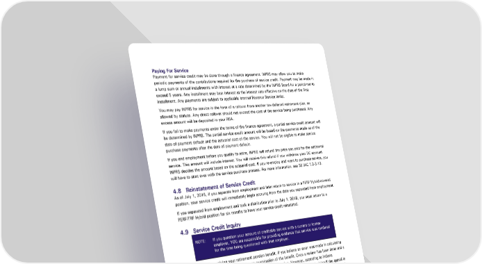 Paying For Service Payment for service credit may be done through a finance agreement. INPRS may allow you to make periodic payments of the contributions required for the purchase of service credit. Payment may be made in a lump sum or annual installments with interest at a rate determined by the INPRS Board for a period not to exceed 5 years. Any installment may bear interest at the interest rate effective on the date of the first installment. Any payments are subject to applicable Internal Revenue Service limits. You may pay INPRS for service in the form of a rollover from another tax-deferred retirement plan, as allowed by statute. Any direct rollover should not exceed the cost of the service being purchased. Any excess amount will be deposited in your RSA. If you fail to make payments under the terms of the finance agreement, a partial service credit amount will be determined by INPRS. The partial service credit amount will be based on the payments made as of the date of payment default and the actuarial cost of the service. You will not be eligible to make service purchase payments after the date of payment default. If you end employment before you qualify to retire, INPRS will refund the price you paid for the additional service. This amount will include interest. You will receive this refund if you withdraw your DC account. INPRS decides the amount based on the actuarial cost. If you re-employ and want to purchase service, you will have to start over with the service purchase process. For more information, see 35 IAC 1.2-3-13. 4.8 Reinstatement of Service Credit As of July 1, 2018, if you separate from employment and later return to service in a PERF Hybrid-covered position, your service credit will immediately begin accruing from the date you separated from employment. If you separated from employment and took a distribution prior to July 1, 2018, you must return to a PERF/TRF Hybrid position for six months to have your service credit reinstated. 4.9 Service Credit Inquiry NOTE: If you question your amount of creditable service with a current or former employer, YOU are responsible for providing evidence that service was rendered for the time being questioned with that employer. After you begin receiving your retirement pension benefit, if you believe an error was made in calculating the creditable service, you may request an examination of the benefit. Once a review has been done and a determination has been made, you may appeal the determination. However, according to Indiana Administrative Orders and Procedures Act, you can only appeal the determination decision if the appeal is requested within six years after the determination of your creditable service or benefit. See IC 5-10.3-8-5. Public Employees’ Retirement Fund Hybrid Plan Page 22 of 48 Member Handbook Effective: 07/01/2024