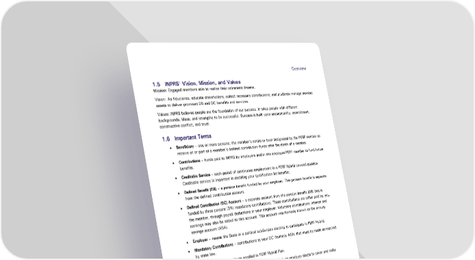 OOveverrvivieeww 1.5 INPRS’ Vision, Mission, and Values Mission: Engaged members able to realize their retirement dreams. Vision: As fiduciaries, educate stakeholders, collect necessary contributions, and prudently manage member assets to deliver promised DB and DC benefits and services. Values: INPRS believes people are the foundation of our success. It takes people with different backgrounds, ideas, and strengths to be successful. Success is built upon accountability, commitment, constructive conflict, and trust. 1.6 Important Terms • Beneficiary – one or more persons, the member’s estate or trust designated by the PERF member to receive all or part of a member’s defined contribution funds after the death of a member. • Contributions – funds paid to INPRS by employers and/or the employee/PERF member to fund future benefits. • Creditable Service – each period of continuous employment in a PERF Hybrid covered position. Creditable service is important in deciding your qualification for benefits. • Defined Benefit (DB) – a pension benefit funded by your employer. This pension benefit is separate from the defined contribution account. • Defined Contribution (DC) Account – a separate account from the pension benefit (DB) that is funded by three percent (3%) mandatory contributions. These contributions are either paid by you, the member, through payroll deductions or your employer. Voluntary contributions, interest and earnings may also be added to this account. This account was formerly known as the annuity savings account (ASA). • Employer – means the State or a political subdivision electing to participate in PERF Hybrid. • Mandatory Contributions – contributions to your DC (formerly ASA) that must be made as required by state law. • Member – a public employee enrolled in PERF Hybrid Plan. • PERF-Covered Position – any qualified position for which an employer elects to cover and make contributions to PERF to fund pension benefits. • Political Subdivision - means a county, city, town, township, political body corporate, public school corporation, public library, public utility of a county, city, town, township, and any department of, or associated with, a county, city, town, or township, which department receives revenue independently of, or in addition to, funds obtained from taxation. See IC 5-10.3-6. • Public Employee – an employee of the state of Indiana, public schools, innovation schools and universities, and other state and government groups. Employees of private companies are not public employees. • Retirement Pension Benefit – a lifetime monthly pension benefit paid either to a qualified member after retirement from PERF-covered employment or to the member’s designated survivor. This pension benefit is also known as the defined benefit (DB) and is funded by PERF employers. Public Employees’ Retirement Fund Hybrid Plan Page 6 of 48 Member Handbook Effective: 07/01/2024
