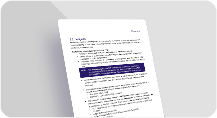 Membership 2.2 Ineligibility Employment by other public employers, such as cities, towns, or school districts, does not automatically mean membership in PERF. Many participating employers choose to offer PERF benefits only to certain employees, not all employees. The following are not eligible to participate in PERF: Employees who are paid wholly on a fee basis or as an independent contractor. Elected officials of a Local Government unless the governing body specifically provides for the participation of locally elected officials. Employees, except employees of a participating school corporation, hired after June 30, 1982, occupying positions normally requiring performance of service of less than 1,000 hours during a year. NOTE: This does not apply to those PERF members who are authorized to participate simultaneously in TRF or those members who are required to participate in both PERF and PARF. No more than one year of service credit can be earned per year. Individuals employed by the State who are classified as federal employees by the United States Secretary of Agriculture and are covered by the federal Social Security program as federal employees. Employees occupying positions normally requiring performance of service of less than 600 hours per year who meet one of the following are also ineligible for PERF membership: ◦ Hired before July 1, 1982 ◦ Employed by a participating school corporation Employees who occupy positions covered by PERF Resolution and at the same time occupy positions covered by another retirement or pension plan supported in whole or in part by either the State of Indiana or a political subdivision. These include but are not limited to the following: ◦ 1977 Police Officersˈ and Firefightersˈ Retirement Fund (1977 Fund) except certain Police or Fire Chiefs ◦ Judgesˈ Retirement System (JRS) ◦ Excise, Gaming and Conservation Officersˈ Retirement Plan (EG&C) ◦ 1953 Police Pension Fund ◦ 1937 Firefighters’ Pension Fund ◦ 1925 Police Pension Fund ◦ Sheriff’s Pension Trust ◦ Indiana State Police Pension Trust Fund NOTE: The 1953 Police Pension Fund, 1937 Firefighters’ Pension Fund, 1925 Police Pension Fund, and Sheriff’s Pension Trust are administered by the State or at the local unit level and not by INPRS. 2.3 PERF Hybrid Plan or PERF My Choice: Retirement Savings Plan As a new employee, you have sixty (60) days from your date of hire to choose between becoming a member of the PERF Hybrid Plan or the PERF My Choice: Retirement Savings Plan (formerly the ASA Only Plan) if: • You are a State of Indiana employee, and you are not statutorily assigned to another pension fund (or excluded from coverage); or Public Employees’ Retirement Fund Hybrid Plan Page 9 of 48 Member Handbook Effective: 07/01/2024