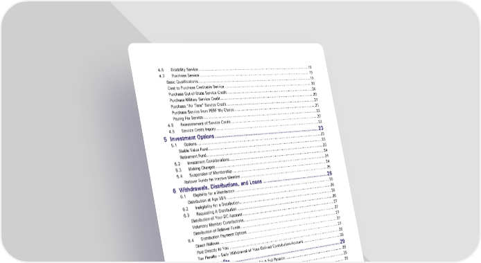 4.6 Disability Service .......................................................................................................... 19 4.7 Purchase Service .......................................................................................................... 19 Basic Qualifications ............................................................................................................ 19 Cost to Purchase Creditable Service ..................................................................................... 20 Purchase Out-of-State Service Credit .................................................................................... 20 Purchase Military Service Credit ........................................................................................... 20 Purchase “Air Time” Service Credit ...................................................................................... 21 Purchase Service from PERF My Choice ................................................................................ 21 Paying For Service ............................................................................................................. 22 4.8 Reinstatement of Service Credit...................................................................................... 22 4.9 Service Credit Inquiry .................................................................................................... 22 5 Investment Options ........................................................................ 23 5.1 Options ....................................................................................................................... 23 Stable Value Fund .............................................................................................................. 23 Retirement Fund ................................................................................................................ 23 5.2 Investment Considerations ............................................................................................. 24 5.3 Making Changes ........................................................................................................... 24 5.4 Suspension of Membership ............................................................................................ 24 Rollover Funds for Inactive Member ...................................................................................... 25 6 Withdrawals, Distributions, and Loans .............................................. 26 6.1 Eligibility for a Distribution ............................................................................................. 26 Distribution at Age 59½ ..................................................................................................... 26 6.2 Ineligibility for a Distribution ........................................................................................... 26 6.3 Requesting A Distribution .............................................................................................. 26 Distribution of Your DC Account .......................................................................................... 27 Voluntary Member Contributions .......................................................................................... 27 Distribution of Rollover Funds .............................................................................................. 27 6.4 Distribution Payment Options ......................................................................................... 27 Direct Rollover................................................................................................................... 27 Paid Directly to You ........................................................................................................... 28 Tax Penalty – Early Withdrawal of Your Defined Contribution Account ...................................... 28 7 Pension Benefits ............................................................................ 29 7.1 Regular Retirement Requirements for A Full Pension .......................................................... 29 7.2 Retirement Effective Date .............................................................................................. 29 7.3 Retirement Benefit Payment Dates .................................................................................. 29 7.4 Calculating A Retirement Pension Benefit Estimate ............................................................ 29 7.5 Final Average Earnings Calculation .................................................................................. 31 7.6 Regular Retirement without Employer Separation (Active, In Service) ................................... 31 7.7 Millie Morgan Retirement ............................................................................................... 31 7.8 Elected Official Retirement ............................................................................................. 32 Retired Members in Elected Positions .................................................................................... 32 7.9 PERF Retirement for Members of PARF ............................................................................ 32 7.10 Early Retirement with a Reduced Benefit .......................................................................... 33 7.11 Disability Retirement ..................................................................................................... 33 Disability Retirement Eligibility ............................................................................................. 33 Disability Benefits .............................................................................................................. 34 Public Employees’ Retirement Fund Hybrid Plan Page 3 of 48 Member Handbook Effective: 07/01/2024