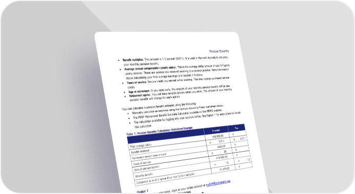 Pension Benefits • Benefit multiplier. This amount is 1.1 percent (0.011). It is used in the math formula to calculate your monthly pension benefit. • Average annual compensation (yearly salary). This is the average dollar amount of your 5 highest yearly salaries. These are salaries you received working in a covered position. More information about calculating your final average earnings is in Section 7.5 below. • Years of service. Service credit you earned while working. This may include purchased service credit. • Age at retirement. If you retire early, the amount of your monthly pension benefit will be less. • Retirement option. You will have several options when you retire. The amount of your monthly pension benefit will change for each option. You can calculate a pension benefit estimate using the following: • Manually calculate an estimate using the formula shown in Table worksheet below. • The PERF Retirement Benefit Estimate Calculator available on the INPRS website. • The calculator available by logging into your account online. See Option 1 for instructions to locate this calculator. Table 1: Pension Benefits Calculation Worksheet Example Example You Final average salary $50,000.00 $ Benefit multiplier X 0.011 X 0.011 Retirement benefit base amount $550.00 $ Years of service X 30 X Annual pension benefit $16,500.00 $ Monthly benefit ÷ 12 ÷ 12 Calculated as an A-1 option (Five Year Certain and Life) $1,375.00 $ Option 1 To use the online calculator, login to your online account at myINPRSretirement.org. 1. Go to the Application and Calculators 2. Select the Calculator Estimate Retirement Benefit. 3. Click on PERF Benefit Estimate Calculator. 4. Fill in Projected Retirement Values. 5. Click Calculate. The results will be an estimate of your monthly pension benefit broken down by the selected options. Option 2 (Social Security Integration) Using one of the available calculator features or the worksheet above, calculate an estimate with the information from your latest Social Security statement. To qualify for this Social Security Integration (SSI) payment option, you must be less than age 62 at retirement and you must enter your estimated Social Security monthly payment amount that Social Security shows for you at age 62. Depending upon your estimated Social Security payment, pension benefit payments will be greatly reduced or terminated at age 62. Public Employees’ Retirement Fund Hybrid Plan Page 30 of 48 Member Handbook Effective: 07/01/2024