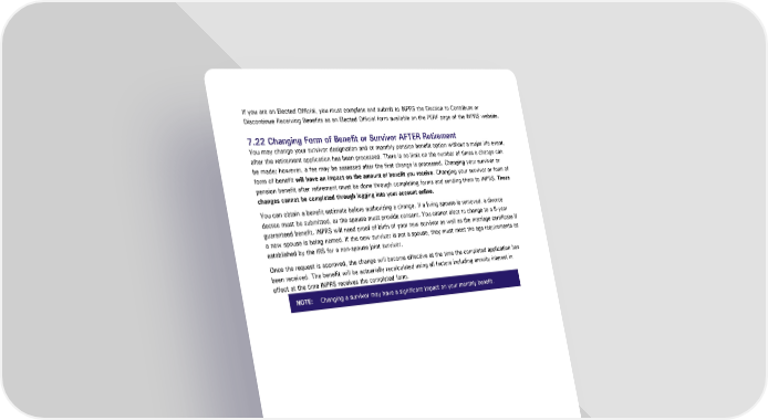 If you are an Elected Official, you must complete and submit to INPRS the Election to Contribute or Discontinue Receiving Benefits as an Elected Official form available on the PERF page of the INPRS website. 7.22 Changing Form of Benefit or Survivor AFTER Retirement You may change your survivor designation and or monthly pension benefit option without a major life event, after the retirement application has been processed. There is no limit on the number of times a change can be made; however, a fee may be assessed after the first change is processed. Changing your survivor or form of benefit will have an impact on the amount of benefit you receive. Changing your survivor or form of pension benefit after retirement must be done through completing forms and sending them to INPRS. These changes cannot be completed through logging into your account online. You can obtain a benefit estimate before authorizing a change. If a living spouse is removed, a divorce decree must be submitted, or the spouse must provide consent. You cannot elect to change to a 5-year guaranteed benefit. INPRS will need proof of birth of your new survivor as well as the marriage certificate if a new spouse is being named. If the new survivor is not a spouse, they must meet the age requirements as established by the IRS for a non-spouse joint survivor. Once the request is approved, the change will become effective at the time the completed application has been received. The benefit will be actuarially recalculated using all factors including annuity interest in effect at the time INPRS receives the completed form. NOTE: Changing a survivor may have a significant impact on your monthly benefit. Public Employees’ Retirement Fund Hybrid Plan Page 40 of 48 Member Handbook Effective: 07/01/2024