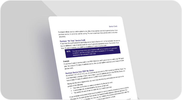SSerervviice Cce Crredediitt Purchased military service credit is added to any other military service credit that is granted by law. If you purchase service, it cannot be used for vesting. The cost to purchase military service credit is calculated actuarially. Purchase “Air Time” Service Credit If you meet the qualifications for purchasing service listed in Section 4.7.1 of this handbook, then you can buy an additional 1 year of service credit for every 5 years of actual earned service. For example, if you have 15 years of service, you could buy an additional 3 years of service credit. NOTE: You may purchase whole years of service credit up to a maximum of 2 years total. In addition, you may purchase partial years in increments of 1/12 (monthly increments) not to exceed 2 years total. Example If you have 6 years of service credit in the PERF Hybrid plan and 4 years of service credit in the TRF Hybrid plan, for a total of 10 years of creditable service, then you are eligible to purchase up to 2 years of Airtime service credit. Purchase Service from PERF My Choice As outlined in IC 5-10.3-7-4.3, you can purchase service credit for PERF Hybrid from PERF My Choice. You must have been a member of both, have at least 1 year of creditable service in the PERF My Choice, and have at least 10 years of creditable service in a PERF Hybrid covered position. Having met the above requirements, you must make the following contributions that are equal to the product of the following: Your salary at the time you make a contribution for the service credit. A percentage rate, as determined by the actuary of the fund. The number of years of service credit that you intend to purchase. If you terminate employment before becoming eligible to receive a monthly allowance or receive a monthly allowance for the same service from another tax supported public employee retirement plan other than under the federal Social Security Act; then you may withdraw the personal contributions made under this section plus accumulated interest after submitting an application for a refund. The following applies to the purchase of service credit under this section: INPRS may allow you to make periodic payments of the contributions required for the purchase of service credit. You may elect to make a transfer of the vested portion of your PERF My Choice DC balance attributable to participation in the public employees' defined contribution plan to purchase service credit. INPRS may deny your application for the purchase of service credit in the fund if the purchase would exceed the limitations under Section 415 of the Internal Revenue Code. You may not claim the service credit for the purpose of determining eligibility or computing benefits unless you have made all the payments required for the purchase of the service credit. Public Employees’ Retirement Fund Hybrid Plan Page 21 of 48 Member Handbook Effective: 07/01/2024