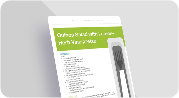 A U G U S T 2 0 2 5 R E C I P E O F T H E M O N T H Quinoa Salad with Lemon- Herb Vinaigrette INGREDIENTS Salad • 1 cup quinoa (rinsed) • 2 cups water or vegetable broth • 1 cup cherry tomatoes, halved • 1 cucumber, diced • 1 red bell pepper, diced • 1/4 cup red onion, finely chopped • 1/2 cup feta cheese, crumbled (optional) • 1/4 cup Kalamata olives, sliced (optional) • 1/4 cup chopped fresh parsley • 2 tbsp chopped fresh mint or basil (optional) Lemon-Herb Vinaigrette • ⅓ cup extra-virgin olive oil • 2 tablespoons apple cider vinegar • 1 tablespoon Dijon mustard • 1 tablespoon honey • 1 medium clove garlic, pressed or minced • ¼ teaspoon fine sea salt DIRECTIONS 1. Cook the Quinoa - In a medium saucepan, bring the water or broth to a boil. Add the rinsed quinoa, reduce to a simmer, cover, and cook for 15 minutes or until all liquid is absorbed. Fluff with a fork and let it cool. 2. Prepare the Vinaigrette - In a small bowl or jar, whisk together olive oil, lemon juice, lemon zest, Dijon mustard, garlic, herbs, salt, and pepper until well combined. 3. Assemble the Salad - In a large mixing bowl, combine the cooled quinoa, cherry tomatoes, cucumber, bell pepper, red onion, feta, olives, and herbs. 4. Dress and Toss - Pour the vinaigrette over the salad and toss well to coat. Adjust seasoning as needed. 5. Chill and Serve - Let the salad chill in the fridge for at least 30 minutes before serving for best flavor. NUTRITIONAL INFORMATION (1 serving) Calories 270 Total fat 17 g Saturated Fat 3 g Sodium 250 mg Carbohydrate 25 g Dietary Fiber 4 g Total sugars 3 g Added Sugars Included 0 g Protein 6 g Makes: 6 Servings