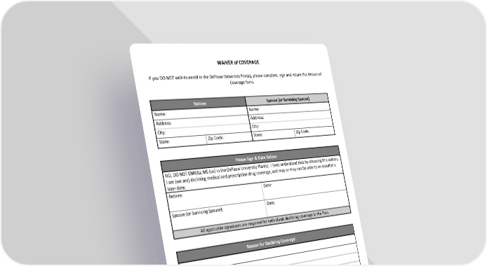 WAIVER of COVERAGE If you DO NOT wish to enroll in the DePauw University Plan(s), please complete, sign and return this Waiver of Coverage form. Retiree Spouse (or Surviving Spouse) Name: Name: Address: Address: City: City: State: Zip Code: State: Zip Code: Please Sign & Date Below: NO, DO NOT ENROLL ME (us) in the DePauw University Plan(s). I (we) understand that by choosing this option, I am (we are) declining medical and prescription drug coverage, and may or may not be able to re-enroll at a later date. Retiree: Date: Spouse (or Surviving Spouse): Date: All applicable signatures are required for individuals declining coverage in the Plan. Reason for Declining Coverage: