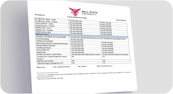PPO Health Plan Summary of Benefits and Coverage Effective 01/01/2026 Pre-Admission Testing – Facility 20% after deductible 50% after deductible Pre-Admission Testing – Physician 20% after deductible 50% after deductible Surgical Expenses – Facility 20% after deductible 50% after deductible Surgical Expenses – Physician 20% after deductible 50% after deductible Inpatient Care – Facility 20% after deductible 50% after deductible Inpatient Care – Physician 20% after deductible 50% after deductible Skilled Nursing Facility 20% after deductible 50% after deductible Additional Services Emergency Room Illness and Accident Benefit 20% after $200 copay after deductible (copay is waived if admitted)-must satisfy emergency criteria Ambulance Benefit 20% after deductible Substance Abuse Benefit 20% after deductible 50% after deductible Mental Health Benefit; Includes Residential Care 20% after deductible 50% after deductible Durable Medical Equipment 20% after deductible 50% after deductible Prosthetics/Orthotics 20% after deductible 50% after deductible Home Health Care 20% after deductible 50% after deductible Hospice Care 20% after deductible 50% after deductible Bariatric Services for Morbid Obesity 20% after deductible; additional criteria required 50% after deductible; additional criteria required ConditionCare Disease Management Solution Program N/A N/A Estimate Your Cost Tool N/A N/A Advanced Imaging Management (AIM) N/A N/A *Abbreviations: EE+CH = Employee Plus Children INN = In-Network OOPM = Out-of-Pocket-Maximum 1 Preventive care is provided when there are no current symptoms or history of medical conditions associated with a particular screening; all preventive services are limited to one of each service per year per covered member. 2 This benefit is for blood work lab charges only.