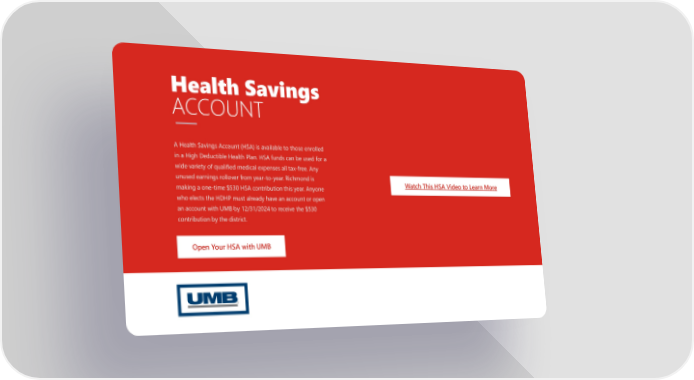 Health Savings ACCOUNT A Health Savings Account (HSA) is available to those enrolled in a High Deductible Health Plan. HSA funds can be used for a wide variety of qualified medical expenses all tax-free. Any unused earnings rollover from year-to-year. Richmond is Watch This HSA Video to Learn More making a one-time $530 HSA contribution this year. Anyone who elects the HDHP must already have an account or open an account with UMB by 12/31/2024 to receive the $530 contribution by the district. Open Your HSA with UMB