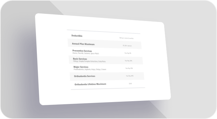 Deductible $50 per covered member Annual Plan Maximum $1,250 / person Preventive Services You Pay 0% Exams, Flouride, Sealants, Space Maint. Basic Services You Pay 20% Fillings, Simple/Complex Extractions, Endo/Perio Major Services You Pay 20% Prosthodontics, Implants, Inlays, Onlays, Crowns Orthodontia Services You Pay 40% Orthodontia Lifetime Maximum $500