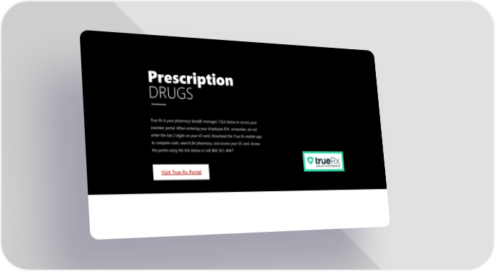 Prescription DRUGS True Rx is your pharmacy benefit manager. Click below to access your member portal. When entering your Employee ID#, remember, do not enter the last 2 digits on your ID card. Download the True Rx mobile app to compare costs, search for pharmacy, and access your ID card. Access the portal using the link below or call 866-921-4047 Visit True Rx Portal