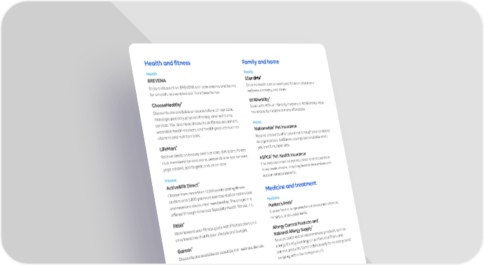 Health and 昀椀tness Family and home Health Family ® BREVENA 23andMe Enjoy a discount on BREVENA skin care creams and balms Save on health and ancestry kits to learn about your for smooth, rejuvenated skin from head to toe. wellness, ancestry, and more. ChooseHealthy® WINFertility® Discounts are available on acupuncture, chiropractic, Save up to 40% on infertility treatment. WINFertility helps massage, podiatry, physical therapy, and nutritional make quality treatment more affordable. services. You also have discounts on 昀椀tness equipment, Home wearable health trackers, and health products such as ® vitamins and nutrition bars. Nationwide Pet Insurance Receive discounts when you enroll through your company LifeMart® or organization. Additional savings are available when Receive deals on beauty and skin care, diet plans, 昀椀tness you enroll multiple pets. club memberships and plans, personal care, spa services, ® yoga classes, sports gear, and vision care. ASPCA Pet Health Insurance Find reduced rates on pet insurance and choose from Fitness three levels of care, including 昀氀exible deductibles and ™ custom reimbursements. Active&Fit Direct Choose from more than 12,000 participating 昀椀tness Medicine and treatment centers and 5,800 premium exercise studios nationwide and receive a discounted membership. This program is Medicine offered through American Specialty Health Fitness, Inc. Puritan’s Pride® ® Choose from a large selection of discounted vitamins, Fitbit Work toward your 昀椀tness goals with Fitbit trackers and minerals, and supplements. smartwatches that 昀椀t your lifestyle and budget. Allergy Control Products and ™ ® National Allergy Supply Garmin Discounts are available on select Garmin wellness devices. Save on select doctor-recommended products, such as allergy-friendly bedding, air puri昀椀ers and 昀椀lters, and Husk Wellness asthma products. Some orders qualify for no-cost ground Discounts are available for gym memberships, shipping within the contiguous U.S. 昀椀tness equipment and technology, and 昀椀tness and Treatment nutrition coaching. The Living Well Courses Choose one of the online wellness programs and save on coaching to help you lose weight, stop smoking, manage stress or diabetes, restore sound sleep, or address alcohol or substance dependence. Learn more about SpecialOffers Log in to anthem.com, choose Care, and select Discounts. Anthem Blue Cross and Blue Shield is the trade name of: In Colorado: Rocky Mountain Hospital and Medical Service, Inc. HMO products underwritten by HMO Colorado, Inc. In Connecticut: Anthem Health Plans, Inc. In Georgia: Blue Cross Blue Shield Healthcare Plan of Georgia, Inc. In Indiana: Anthem Insurance Companies, Inc. In Kentucky: Anthem Health Plans of Kentucky, Inc. In Maine: Anthem Health Plans of Maine, Inc. In Missouri (excluding 30 counties in the Kansas City area): RightCHOICE® Managed Care, Inc. (RIT), Healthy Alliance® Life Insurance Company (HALIC), and HMO Missouri, Inc. RIT and certain af昀椀liates administer non-HMO bene昀椀ts underwritten by HALIC and HMO bene昀椀ts underwritten by HMO Missouri, Inc. RIT and certain af昀椀liates only provide administrative services for self-funded plans and do not underwrite bene昀椀ts. In Nevada: Rocky Mountain Hospital and Medical Service, Inc. HMO products underwritten by HMO Colorado, Inc., dba HMO Nevada. In New Hampshire: Anthem Health Plans of New Hampshire, Inc. HMO plans are administered by Anthem Health Plans of New Hampshire, Inc. and underwritten by Matthew Thornton Health Plan, Inc. In Ohio: Community Insurance Company. In Virginia: Anthem Health Plans of Virginia, Inc. trades as Anthem Blue Cross and Blue Shield in Virginia, and its service area is all of Virginia except for the City of Fairfax, the Town of Vienna, and the area east of State Route 123. In Wisconsin: Blue Cross Blue Shield of Wisconsin (BCBSWI), underwrites or administers PPO and indemnity policies and underwrites the out of network bene昀椀ts in POS policies offered by Compcare Health Services Insurance Corporation (Compcare) or Wisconsin Collaborative Insurance Corporation (WCIC). Compcare underwrites or administers HMO or POS policies; WCIC underwrites or administers Well Priority HMO or POS policies. Independent licensees of the Blue Cross Blue Shield Association. Anthem is a registered trademark of Anthem Insurance Companies, Inc.