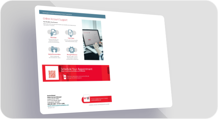 Huntington County Community School Corporation Huntington County Community School Corporation Online Account Support New Career, New Choices Your Benefits, Your Account Starting a new job can be overwhelming, and your insurance options can be confusing. Within your online account, you’ll find all your benefits and reimbursement What you select may be one of the most important things you do this year. information in one place. Get help with your options. Stop by and see an American Fidelity account manager. Accident Only Insurance AF™ Limited Benefit Accident Only Insurance may help manage out-of-pocket costs to treat injuries resulting from a • File a Claim Track Claims covered accident provides benefit payments directly to you Submit claims for your View the status of your benefits • insurance benefits or and reimbursements claims americanfidelity.com/info/accident reimbursement accounts Cancer Insurance AF™ Limited Benefit Individual Cancer Insurance may help ease the financial burden of cancer treatment, so you can focus • on recovery provides benefit payments directly to you Upload Documentation Manage Preferences • Attach receipts and Edit your profile, enroll in americanfidelity.com/info/cancer documentation for claims direct deposit, and elect communication preferences Short-Term Disability Income Insurance AF™ Short-Term Disability Income Insurance provides part of your monthly income during your qualifying disability • coverage period allows you to use -benefit dollars to pay for living expenses Schedule Your Appointment • AHEEEHAPMPNGEBCJCBFFCOKGKPAHEEEHA https://enroll.americanfidelity.com/959B56B9 americanfidelity.com/info/disability BNFFFNBPACMLBPJCJPBPJKJPEPBNFFFNB DOEAACFPKNFMHHCEKHJLJIOCHOBDECAMK EMODALFIFNDBFNJLKJGEKGJCIEMLHAOJL KCHFCNFDHJFNHEBMIAKCLPFKEHKAEKINC HMEGIMFLLBILEAGAFNKPFAGOFILKGBMFD Point your smart phone camera at the QR code MFNNFFEPKBLLAHCEKHJLAIGIAHFHAOIGD Critical Illness Insurance APBBBPAPBONBHFBDKLFMKEIMHCFFCBOPD and open the link that appears. HHHHHHHPHHPHHPHPPHPHPPHPHHPHPHPHP AF™ Limited Benefit Critical Illness Insurance pays a benefit upon diagnosis of certain covered life-altering illnesses • helps with costs not covered by medical insurance • americanfidelity.com/info/critical-illness Cancer Austin Weaver In the U.S., men and women Senior Account Manager have a 1 in 3 lifetime risk of Indiana Branch Office 8770GuionRoad,SuiteR American Fidelity Assurance Company Indianapolis, IN 46268 americanfidelity.com E M P L O Y E R B E N E F I T developing cancer. 800-638-4268·317-871-2480 S O L U T I O N S American Cancer Society: Cancer Facts and Figures 2019, pg. 14. F O R E D U C AT I O N austin.weaver@americanfidelity.com Limitations, exclusions and waiting periods may apply. SB-33041-0120