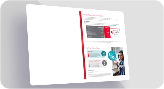 Hospital Indemnity Insurance AF™ Limited Benefit Hospital Indemnity Insurance An Easy Way to Pay for Expenses helps pay for out-of-pocket costs, like a hospital stay • Would you like to gain tax savings when paying for medical or dependent care costs? With a Section 125 Plan, your money can be when used with a Health Savings Account allows for a tax benefit and • taken from your paycheck pre-tax and used for eligible costs. And since your money is taken out pre-tax, it reduces your taxable potential savings americanfidelity.com/info/hospital-indemnity income, and allows you to take home more money in each paycheck. How Does it Work? Term Life Insurance Look at the example below. Jane makes $4,000 per paycheck and is paid monthly. Under a Section 125 Plan, she would save $82.96 a month. That’s a savings of $995.52 a year. To calculate your possible savings, visit americanfidelity.com/s125-calculator AF™ Term Life Insurance 24/7 Access to is a renewable and convertible term life insurance policy for which rates • Earnings & Hours Without 125 With 125 are guaranteed not to increase during the initial term Your Benefits Gross Pay $4,000 $4,000 allows you to choose from 10, 20, or 30-year term periods • Health Insurance -$300 -$300 is owned by you, so you can take it with you to a different job or With AFmobile®, you can manage Health FSA Contribution N/A -$300 A savings • into retirement your reimbursement accounts $ .52 americanfidelity.com/info/life and insurance benefits from Taxable Income $3,700 $3,400 of 995 the palm of your hand. Taxes (Federal & State @ 20%) -$740 -$680 a year Whole Life Insurance Download AFmobile today. Less Estimated FICA (7.65%) -$283.05 -$260.10 Out-of Pocket Medical Expenses -$300 N/A AF™ Whole Life Insurance Take Home Pay $2,376.95 $2,459.90 provides a guaranteed death benefit, cash value, and premiums up to age 121 • allows for full cash value flexibility to stop paying premiums and still have • some life insurance coverage in force americanfidelity.com/afmobile is owned by you, so you can take it with you to a different job or • Where allowable by law. If you are subject to FICA taxes, there might be a reduction in your social security benefit due to the reduction of FICA contributions. into retirement Example is hypothetical for illustrative purposes only. Please consult your tax advisor for actual tax savings. americanfidelity.com/info/life Flexible Spending Accounts File Your Claims Faster Everyone likes saving money. Flexible spending accounts (FSA) allow you to save part of your ® AFmobile paycheck, before taxes, to pay for eligible costs throughout the year. Our mobile app is the easiest way to Types of Accounts submit your claims and documentation. Upload documentation* directly from • Healthcare FSAs your device’s picture gallery. • Limited Purpose FSAs • Dependent Care Accounts To calculate medical costs that may not be covered by insurance, visit ® Explore your savings options at americanfidelity.com/info/fsa americanfidelity.com/fsa-worksheet americanfidelity.com Filing online is convenient, secure, and provides faster claim processing Examples of Eligible Expenses than filing by paper. From your laptop or desktop, log in to file a • Asthma treatments • Eye exam/eyeglasses • Physical therapy claim and upload documentation*. • Chiropractic care • Fertility treatments • Prescriptions • Contact lenses • Laser eye surgery • Prenatal care • Copays • Over-the-counter bandages • Sunscreen with 15 SPF or higher Need assistance? • Dental services • Physical exams • Walkers/wheelchairs Visit americanfidelity.com/fileaclaim americanfidelity.com/eligible-expenses *The Internal Revenue Code regulations require proof of eligible expenses using itemized receipts or other documentation showing the date of service, person for whom service was provided and description of the expense. Depending on the type of expense, documentation may come in the form of third party itemized statements or Explanation of Benefits.