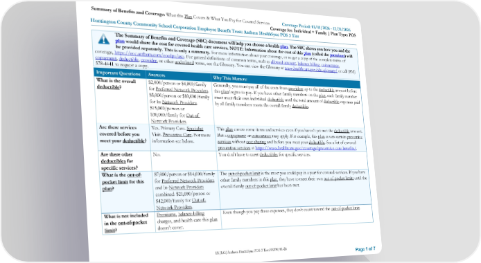 IN/LG/Anthem HealthSync POS 3 Tier/8X5W/01 - 2 6 Page 1 of 7 Summary of Benefits and Coverage: What this Plan Covers & What You Pay for Covered Services Coverage Period: 01/01/2026 - 12/31/2026 Coverage for: Individual + Family | Plan Type: POS Huntington County Community School Corporation Employee Benefit Trust: Anthem HealthSync POS 3 Tier The Summary of Benefits and Coverage (SBC) document will help you choose a health plan . The SBC shows you how you and the plan would share the cost for covered health care services. NOTE: Information about the cost of this plan (called the premium ) will be provided separately. This is only a summary. For more information about your coverage, or to get a copy of the complete terms of coverage, https://eoc.anthem.com/eocdps/aso . For general definitions of common terms, such as allowed amount , balance billing , coinsurance , copayment , deductible , provider , or other underlined terms, see the Glossary. You can view the Glossary at www.healthcare.gov/sbc-glossary/ or call (833) 578-4441 to request a copy. Important Questions Answers Why This Matters: What is the overall deductible? $2,000/person or $4,000/family for Preferred Network Providers. $5,000/person or $10,000/family for In-Network Providers. $15,000/person or $30,000/family for Out-of- Network Providers. Generally, you must pay all of the costs from providers up to the deductible amount before this plan begins to pay. If you have other family members on the plan, each family member must meet their own individual deductible until the total amount of deductible expenses paid by all family members meets the overall family deductible. Are there services covered before you meet your deductible? Yes. Primary Care. Specialist Visit. Preventive Care. For more information see below. This plan covers some items and services even if you haven’t yet met the deductible amount. But a copayment or coinsurance may apply. For example, this plan covers certain preventive services without cost sharing and before you meet your deductible. See a list of covered preventive services at https://www.healthcare.gov/coverage/preventive-care-benefits/ . Are there other deductibles for specific services? No. You don't have to meet deductibles for specific services. What is the out-of - pocket limit for this plan? $7,000/person or $14,000/family for Preferred Network Providers and In-Network Providers combined. $21,000/person or $42,000/family for Out-of- Network Providers. The out-of-pocket limit is the most you could pay in a year for covered services. If you have other family members in this plan, they have to meet their own out-of-pocket limits until the overall family out-of-pocket limit has been met. What is not included in the out-of-pocket limit? Premiums , balance - billing charges, and health care this plan doesn't cover. Even though you pay these expenses, they don’t count toward the out-of-pocket limit.