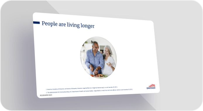 People are living longer 1 American Academy of Actuaries and Society of Actuaries, Actuaries Longevity Illustrator, longevityillustrator.org (accessed November 29, 2021). 2 The Administration for Community Living, U.S. Department of Health and Human Services. acl.gov/ltc/basic-needs/how-much-care-will-you-need (accessed November 29, 2021). RO2834090-0423