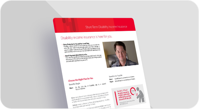 Long-Term Disability Income Insurance Short-Term Disability Income Insurance Benefits Are Payable Plan I - Up to 90 days for a covered Injury or Sickness. Plan II - Up to 150 days for a covered Injury or Sickness. • Salary Protection for You and Your Loved Ones Provides a steady benefit to cover expenses while you are unable to work. The plan makes it easy to help protect your future income in case of a sudden injury or sickness. The plan pays a percentage of your gross monthly income once you have satisfied the elimination period. • Benefit Payments Made Directly to You Your monthly benefit payments may be deposited directly into your bank account. This gives you the freedom to pay your living expenses and make other purchases as you see fit. Choose the Right Plan for You Benefits Begin Plan I - On the 31st day of Disability due to a covered Injury or Sickness. Injury means physical harm or damage to the body you sustained which results directly from an accidental bodily injury, is independent of disease or bodily infirmity; and takes place while your coverage is in force. Sickness means a disease or illness (including pregnancy). Disability must begin while your coverage is in force. Hospital- the term “Hospital” shall not include an institution used by you as a place for rehabilitation; a place for rest or for the aged; a nursing or convalescent home; a long-term nursing unit or geriatrics ward; or an extended care facility for the care of convalescent, rehabilitative, or ambulatory patients. Disability income insurance is here for you. If you reside in a state other than your employer’s state of domicile, where required by law, policy provisions and benefits may vary. 77% In 2015, 77% of injuries requiring medical attention suffered by workers occured off the job. National Safety Council, Injury Facts, 2017 Edition, p. 63.