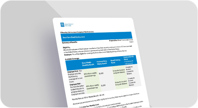 How Long Benefits Last - Once you qualify for benefits under this plan, the maximum number of weekly Disability benefits is 13 weeks for an Accident and 13 weeks for a Sickness. Disability benefits will end sooner if you no longer qualify for benefits. When Coverage Takes Effect - Your coverage takes effect on the later of the policy’s effective date, the date you become eligible, the date we receive your completed enrollment form if required, or the date you authorize any necessary payroll deductions if applicable. If you’re not actively at work on the date your coverage would otherwise take effect, your coverage will take effect on the date you return to work. If you have to submit proof of good health, your coverage takes effect on the date we agree, in writing, to cover you. Benefit Reductions, Conditions, Limitations and Exclusions: Effects of Other Income Benefits - This plan is structured to prevent your total benefits and post-disability earnings from equaling or exceeding pre-disability earnings. Therefore, we reduce this plan’s benefits by an amount equal to any Social Security retirement and/or disability benefits payable to you, your dependents, or a qualified third party on behalf of you or your dependents. Your disability benefits will not be reduced by any Social Security disability benefits you are not receiving as long as you cooperate fully in efforts to obtain them and agree to repay any overpayment when and if you do receive them. Disability benefits will be reduced by amounts received through other government programs, sick pay, employer funded retirement benefits, workers’ compensation, franchise/group insurance, auto no-fault, and damages for wage loss. For details, see your Certificate of Insurance. Pre-existing Condition Limitation - Benefits are not payable for medical conditions for which you incurred expenses, took prescription drugs, received medical treatment, care or services (including diagnostic measures), or for which a reasonable person would have consulted a physician during the 3 months just prior to the most recent effective date of insurance. Benefits are not payable for any disability resulting from a pre-existing condition unless the disability occurs after you have been insured under this plan for at least 6 months after your most recent effective date of insurance. Termination of Disability Benefits - Your benefits will terminate when your Disability ceases, when your benefit duration period is exceeded, you earn more than your allowable Covered Earnings, or the date benefits end because you did not comply with the terms and conditions of the policy. Exclusions - This plan does not pay benefits for a Disability which results, directly or indirectly, from any of the following: Suicide, attempted suicide, or intentionally self-inflicted injury while sane or insane; War or any act of war, whether or not declared; Active participation in a riot; Commission of a felony; The revocation, restriction or non-renewal of an Employee’s license, permit or certification necessary to perform the duties of his or her occupation unless due solely to Injury or Sickness otherwise covered by the Policy; Any cosmetic surgery or surgical procedure that is not Medically Necessary; An Injury or Sickness for which the Employee is entitled to benefits from Workers' Compensation or occupational disease law; An Injury or Sickness that is work related. In addition, the plan does not pay disability benefits any period of Disability during which you are incarcerated in a penal or corrections institution. 1. Your benefit amount will be reduced by any amounts payable to you by any of the sources listed under the “Effects of Other Income Benefits” section. Terms and conditions of coverage for Short Term Disability insurance are set forth in Group Policy No. VDT0962155. This is not intended as a complete description of the insurance coverage offered. This is not a contract. Complete coverage details, including premiums, are contained in the Policy Certificate. If there are any differences between this summary and the group policy, the information in the group policy takes precedence. Product availability and/or features may vary by state. Please keep this material as a reference. Insurance coverage is issued on group policy form number: Policy Form TL-004700. Coverage is underwritten by Life Insurance Company of North America, 51 Madison Avenue, New York, NY 10010. Group insurance products are insured by Life Insurance Company of North America and New York Life Group Insurance Company of NY, affiliates of New York Life Insurance Company. ©2024 New York Life Group Insurance Company, New York, NY. All Rights Reserved. NEW YORK LIFE and the New York Life box logo are trademarks of New York Life Insurance Company. Created on 05/2024