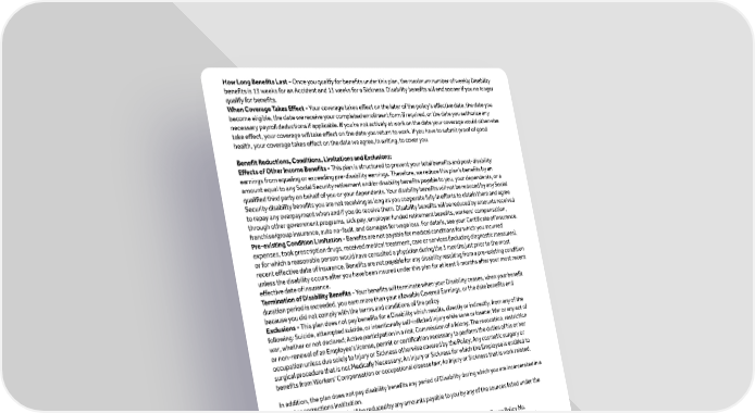How Long Benefits Last - Once you qualify for benefits under this plan, the maximum number of weekly Disability benefits is 13 weeks for an Accident and 13 weeks for a Sickness. Disability benefits will end sooner if you no longer qualify for benefits. When Coverage Takes Effect - Your coverage takes effect on the later of the policy’s effective date, the date you become eligible, the date we receive your completed enrollment form if required, or the date you authorize any necessary payroll deductions if applicable. If you’re not actively at work on the date your coverage would otherwise take effect, your coverage will take effect on the date you return to work. If you have to submit proof of good health, your coverage takes effect on the date we agree, in writing, to cover you. Benefit Reductions, Conditions, Limitations and Exclusions: Effects of Other Income Benefits - This plan is structured to prevent your total benefits and post-disability earnings from equaling or exceeding pre-disability earnings. Therefore, we reduce this plan’s benefits by an amount equal to any Social Security retirement and/or disability benefits payable to you, your dependents, or a qualified third party on behalf of you or your dependents. Your disability benefits will not be reduced by any Social Security disability benefits you are not receiving as long as you cooperate fully in efforts to obtain them and agree to repay any overpayment when and if you do receive them. Disability benefits will be reduced by amounts received through other government programs, sick pay, employer funded retirement benefits, workers’ compensation, franchise/group insurance, auto no-fault, and damages for wage loss. For details, see your Certificate of Insurance. Pre-existing Condition Limitation - Benefits are not payable for medical conditions for which you incurred expenses, took prescription drugs, received medical treatment, care or services (including diagnostic measures), or for which a reasonable person would have consulted a physician during the 3 months just prior to the most recent effective date of insurance. Benefits are not payable for any disability resulting from a pre-existing condition unless the disability occurs after you have been insured under this plan for at least 6 months after your most recent effective date of insurance. Termination of Disability Benefits - Your benefits will terminate when your Disability ceases, when your benefit duration period is exceeded, you earn more than your allowable Covered Earnings, or the date benefits end because you did not comply with the terms and conditions of the policy. Exclusions - This plan does not pay benefits for a Disability which results, directly or indirectly, from any of the following: Suicide, attempted suicide, or intentionally self-inflicted injury while sane or insane; War or any act of war, whether or not declared; Active participation in a riot; Commission of a felony; The revocation, restriction or non-renewal of an Employee’s license, permit or certification necessary to perform the duties of his or her occupation unless due solely to Injury or Sickness otherwise covered by the Policy; Any cosmetic surgery or surgical procedure that is not Medically Necessary; An Injury or Sickness for which the Employee is entitled to benefits from Workers' Compensation or occupational disease law; An Injury or Sickness that is work related. In addition, the plan does not pay disability benefits any period of Disability during which you are incarcerated in a penal or corrections institution. 1. Your benefit amount will be reduced by any amounts payable to you by any of the sources listed under the “Effects of Other Income Benefits” section. Terms and conditions of coverage for Short Term Disability insurance are set forth in Group Policy No. VDT0962155. This is not intended as a complete description of the insurance coverage offered. This is not a contract. Complete coverage details, including premiums, are contained in the Policy Certificate. If there are any differences between this summary and the group policy, the information in the group policy takes precedence. Product availability and/or features may vary by state. Please keep this material as a reference. Insurance coverage is issued on group policy form number: Policy Form TL-004700. Coverage is underwritten by Life Insurance Company of North America, 51 Madison Avenue, New York, NY 10010. Group insurance products are insured by Life Insurance Company of North America and New York Life Group Insurance Company of NY, affiliates of New York Life Insurance Company. ©2024 New York Life Group Insurance Company, New York, NY. All Rights Reserved. NEW YORK LIFE and the New York Life box logo are trademarks of New York Life Insurance Company. Created on 05/2024