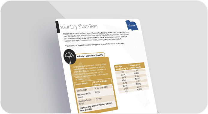 Voluntary Short-Term Because this insurance is offered through Noblesville Schools, you'll have access to competitive group rates that may be more affordable than those available through individual insurance. You'll also have the convenience of having your premium deducted directly from your paycheck. How much your premium costs depends on a number of factors, such as your age and benefit amount. * No evidence of insurability; 60 day waiting period for benefits for sickness or pregnancy. Voluntary Short-Term Disability When you need to miss work for an extended period of time due to an illness or accident, Your Age Rate per $10 of short-term disability insurance can replace a (as of January 1) Weekly Benefit percentage of your lost income (up to a