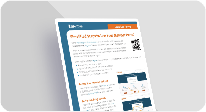 Member Portal Simplified Steps to Use Your Member Portal Go to memberportal.navitus.com or scan the QR code* to access the member portal. Register for your account, if you haven’t already done so. If you have the Navitus mobile app, you can log into the Navitus member portal with the same username and password you created for the app. There is no need to register again. Once registered, click Sign In, then enter your login details and password. From here you can: ■ Access your member ID card ■ Perform a Drug Search for coverage details ■ Find drug prices and pharmacy locations ■ Easily track your medication history Access Your Member ID Card From the landing page, click View now to see a digital copy of your Member ID card. You can also Save as PDF and print your card. Perform a Drug Search From the landing page, enter at least the first letter of the drug name in the Get Started search box. Click on the specific drug name from the dropdown menu of search suggestions. You will be prompted to Make a Selection. ■ Click on the down arrow for a refined list. ■ Select the dosage form, strength and brand or generic designation you need. ■ Adjust the Total Quantity and Number of Days for that supply. The coverage indicator uses these details to show whether the medication is covered under your plan and at what tier, helping you make an informed decision. © 2025 Navitus Health Solutions, LLC. All rights reserved. 052469-0125