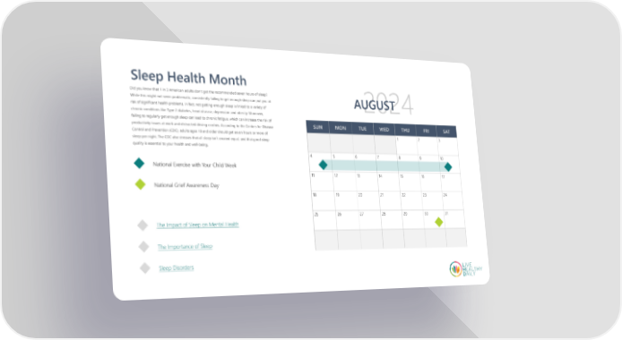 Sleep Health Month Did you know that 1 in 3 American adults don’t get the recommended seven hours of sleep? While this might not seem problematic, consistently failing to get enough sleep can put you at AUGUST risk of significant health problems. In fact, not getting enough sleep is linked to a variety of chronic conditions like Type 2 diabetes, heart disease, depression and obesity. Moreover, failing to regularly get enough sleep can lead to chronic fatigue, which can increase the risk of SUN MON TUE WED THU FRI SAT productivity issues at work and distracted driving crashes. According to the Centers for Disease Control and Prevention (CDC), adults ages 18 and older should get seven hours or more of 1 2 3 sleep per night. The CDC also stresses that all sleep isn’t created equal, and that good sleep quality is essential to your health and well-being. 4 5 6 7 8 9 10 National Exercise with Your Child Week 11 12 13 14 15 16 17 National Grief Awareness Day 18 19 20 21 22 23 24 25 26 27 28 29 30 31 The Impact of Sleep on Mental Health The Importance of Sleep Sleep Disorders