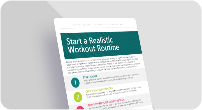 JANUARY 2025 BEST PRACTICES FOR PREVENTIVE CARE Start a Realistic Workout Routine Regular physical exercise is one of the best things you can do for your health. According to the U.S. Department of Health and Human Services, exercise can boost brain health, reduce the risk of disease and help you manage weight. However, many adults struggle to find the time and motivation to maintain a regular fitness routine. Getting enough exercise often comes down to prioritizing movement and getting creative with planning, so consider the following tips when starting a realistic routine: START SMALL Begin with short sessions and then increase the time and difficulty. If you overdo it, you may experience muscle soreness, become discouraged and quit. CHOOSE A FUN WORKOUT Find an activity you enjoy—or are good at— and incorporate it into your routine. You’re more likely to stick with your workout routine if you’re having fun. MOVE WHEN YOUR ENERGY IS HIGH Plan your workouts for the times of day when you have the most energy. For example, you may find it best to work out in the mornings before other things come up during your day. SCHEDULE WORKOUTS Putting workouts on your calendar can help you commit to a routine. If you need to change the scheduled workout, reschedule it on your calendar immediately. FIND A WORKOUT PARTNER Working out with a friend or personal trainer can make exercise more fun and help you stay accountable. If you can’t work out with someone, pick an accountability partner and check in with each other about your fitness journey. 401 Pennsylvania Pkwy Suite 200 Office: Indianapolis, IN 46280 Population Health: LHDbenefits.com [email protected]