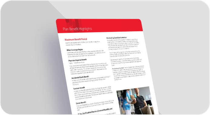 Plan Benefit Highlights Maximum Benefit Period Pre-Existing Condition Limitation Benefits are payable up to 90 (Plan I) or 150 (Plan II) days for a No disability benefit will be payable if Disability is caused by or covered Injury or Sickness. resulting from a Pre-Existing Condition and begins before you have been continuously covered under the policy for 12 months. This provision will not apply if you have: received no treatment When Coverage Begins and received no diagnosis or advice from a physician, for 12 Certificates will become effective on the requested effective date consecutive months for such condition(s). following the date we approve the application, provided you are on This limitation will not apply to a Disability resulting from a Pre- active employment and premium has been paid. Existing Condition that begins after you have been continuously Physician Expense Benefit covered under the policy for 12 months. Injury - $150.00 per Injury Any increase in benefits will be subject to this Pre-Existing If you need personal treatment by a physician due to an Injury, we Condition limitation. A new Pre-Existing Condition period must will pay the amount shown above provided no other claim has been be met with respect to any increase applied for and approved paid under the policy. You are not required to miss one full day by us. of work in order to receive the Injury benefit. This benefit will be Pre-Existing Condition means a disease, Injury, Sickness, physical limited to 8 payments per calendar year. condition or mental illness for which you: recieved treatment; or Accidental Death Benefit received a diagnosis or advice from a physician, during the 12 month period immediately before your effective date of coverage. A lump sum of $50,000 will be paid to your designated beneficiary if The term Pre-Existing Condition will also include conditions which you die as the direct result of an Injury within 90 days after are related to such disease, Injury, Sickness, physical condition, or the Injury. mental illness. Survivor Benefit A lump sum benefit equal to 3 times the Disability payment will be paid if on the date of your death your Disability had continued for 90 or more consecutive days and you were receiving or entitled to receive Disability payments. The Survivor Benefit may be paid earlier if you have a terminal illness. Donor Benefit If you are Disabled as a result of being an organ or tissue donor, we will pay your benefit as any other Sickness under the terms of the plan. If You Are Disabled Due to a Covered Disability and Not Working We will pay the disability Benefit described in the benefit schedule. No Disability payment will be provided for any period in which you are not under the regular and appropriate care of a physician.