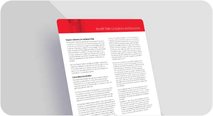 Benefit Rider Limitations and Exclusions Hospital Indemnity Limited Benefit Rider Spouse is incarcerated in a penal or correctional institution or The Hospital Confinement Benefit will not be payable for an Injury for any Injury that occurs while your Spouse is incarcerated in or Sickness incurred in the first 12 months of coverage if the Injury a penal or correctional institution; Injury arising out of and in or Sickness is caused by or resulting from a Pre-Existing Condition the course of any occupation for wage or profit or for which as defined in the policy. In addition to the exclusions listed in the your Spouse is entitled to Workers’ Compensation. The term policy, no benefits will be payable under this rider for any Hospital “entitled to Workers’ Compensation” shall also include Workers’ confinement that is caused by or resulting from mental illness Compensation claim settlements which occur via compromise or drug or alcohol abuse. Benefits are reduced by 50% at age 70. and release. Further, no benefits will be paid under this policy Successive Hospital stays will be considered as one confinement for any period during which your Spouse is entitled to Workers’ if they are separated by less than 90 days of confinement to a Compensation benefits; participation in any sport for wage or Hospital. profit; participation in any contest of speed in a power driven vehicle for wage or profit. The term “Hospital” shall not include an institution used by you as Spouse means the person you are lawfully married to who is a place for rehabilitation; a place for rest or for the aged; a nursing less than age 70. Your spouse must be engaged in Full-Time or convalescent home; a long-term nursing unit or geriatrics Employment for benefits to be payable. Full-Time Employment ward; or as an extended care facility for the care of convalescent, means your spouse is employed an average of 25 or more rehabilitative , or ambulatory patients. hours per week for pay or benefits. Full-Time Employment Critical Illness Benefit Rider does not include any hours your spouse is working while self- The Critical Illness Benefit rider will not be payable for any loss employed. No benefits are payable for your Spouse under this caused by or resulting from: a Critical Illness when the date rider for a Disability from an Injury that occurred outside of the of diagnosis occurs during the waiting period; a Critical Illness United States or its territories. No benefit will be provided for diagnosed outside of the United States; or a Sickness or Injury not any period in which your Spouse is not under the regular and specifically defined in this Rider. appropriate care of a physician. No benefits will be paid for any Injury to your Spouse which is caused by or resulting from No Critical Illness Benefit will be payable for a Critical Illness which Spousal abuse. is caused by or resulting from a Pre-Existing Condition when the Your coverage with respect to the riders listed above will end Critical Illness date of diagnosis occurs before you have been on the earliest of these dates: the end of the last period for continuously covered under this rider for 12 consecutive months. which premium has been paid; the date you notify us in writing Following 12 consecutive months this exclusion does not apply. to terminate coverage; the date the rider is discontinued; the Pre-Existing Condition means a disease, Injury, Sickness, physical date the policy is discontinued; or the date your employment condition or mental illness for which you have experienced any of terminates. the following: received treatment or received a diagnosis or advice Availability of riders may vary by state, employer and short- from a Physician, during the 12-month period immediately before term coverage with a benefit period of less than 12 months. the Effective Date of this Rider. The term Pre-Existing Condition Additional riders are subject to our general underwriting will also include conditions which are related to such disease, guidelines and coverage is not guaranteed. Riders have Injury, Sickness, physical condition or mental illness. Benefits limitations, exclusions, and waiting periods. Refer to your policy reduce by 50% at age 70. No benefits will be paid for a Critical for complete details. These riders will terminate on the same Illness when the date of diagnosis occurs during the Critical Illness date as the policy or certificate to which it is attached. waiting period. The waiting period is 30 days from the effective date of this rider. COBRA Funding Benefit Rider Proof of election of medical COBRA continuation must be provided to American Fidelity. Proof of continued medical COBRA participation will be required before benefits are paid under this rider. Your employment must have terminated for the benefit to be payable. Spousal Accident Only Disability Benefit Rider This rider does not provide benefits for your Spouse for any Disability, fatal or non-fatal, which results from any of the following: intentionally self-inflicted Injury while sane or insane; an act of war, declared or undeclared; Injury sustained or contracted while in the service of the armed forces of any country; committing a felony; penal incarceration. American Fidelity will not pay benefits during any period for which your